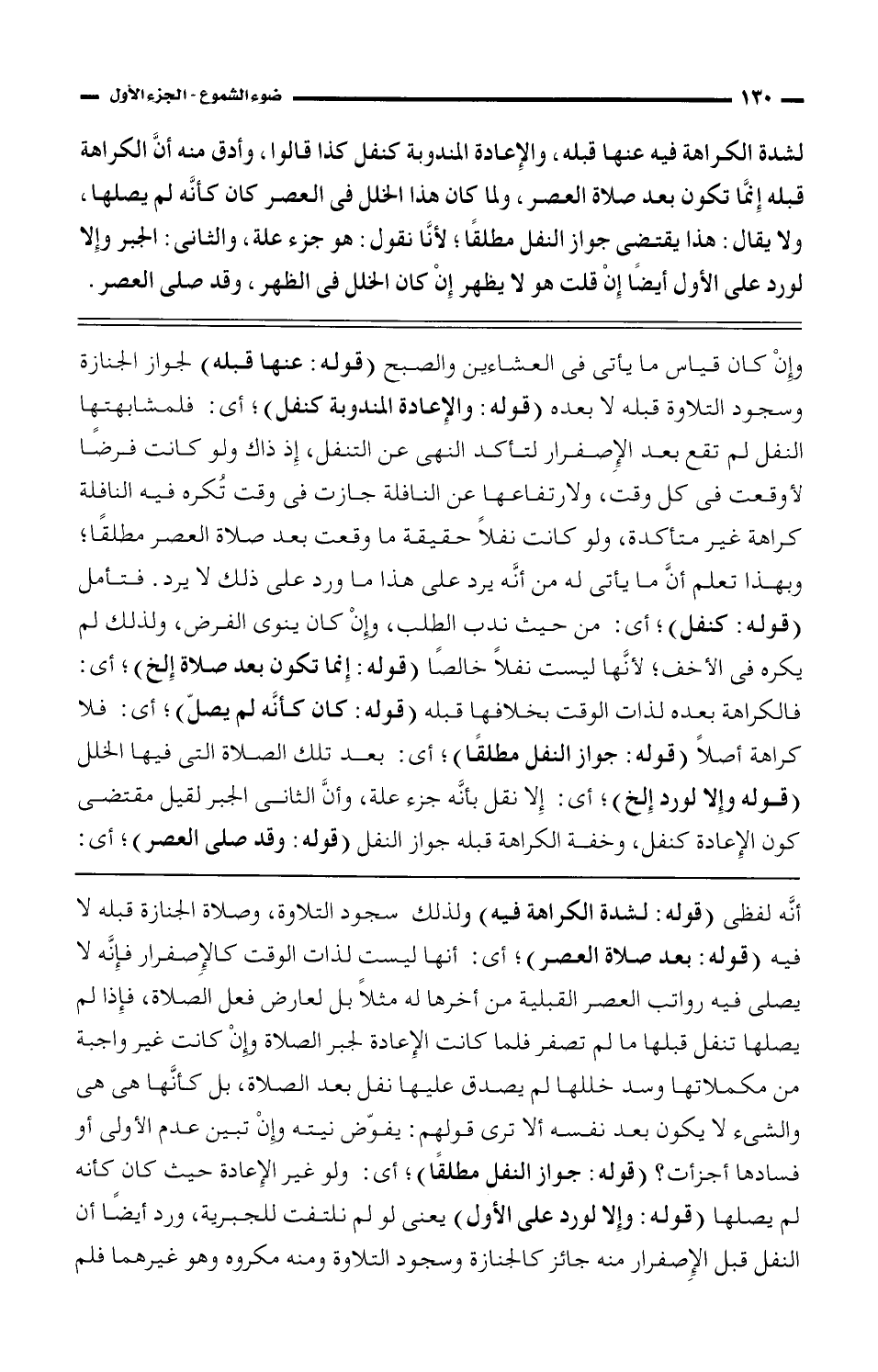 أنه لفظى (قوله: لشدة الكراهة فيه) ولذلك سجود التلاوة، وصلاة الجنازة قبله لا فيه (قوله: بعد صلاة العصر)؛ أى: أنها ليست لذات الوقت كالاصفرار فإنه لا يصلى فيه رواتب العصر القبلية من أخرها له مثلًا بل لعارض فعل الصلاة، فإذا لم يصلها تنفل قبلها ما لم تصفر فلما كانت الإعادة لجبر الصلاة وإن كانت غير واجبة من مكملاتها وسد خللها لم يصدق عليها نفل بعد الصلاة، بل كأنها هى هى والشئ لا يكون بعد نفسه ألا ترى قولهم: يفوض نيته وإن تبين عدم الأولى أو فسادها أجزأت؟ (قوله: جواز النفل مطلقصا)؛ أى: ولو غير الإعادة حيث كان كأنه لم يصلها (قوله: وإلا لورد على الأول) يعنى لو لم نلتفت للجبرية، ورد أيضًا أن النفل قبل الاصفرار منه جائز كالجنازة وسجود التلاوة ومنه مكروه وهو غيرهما فلم