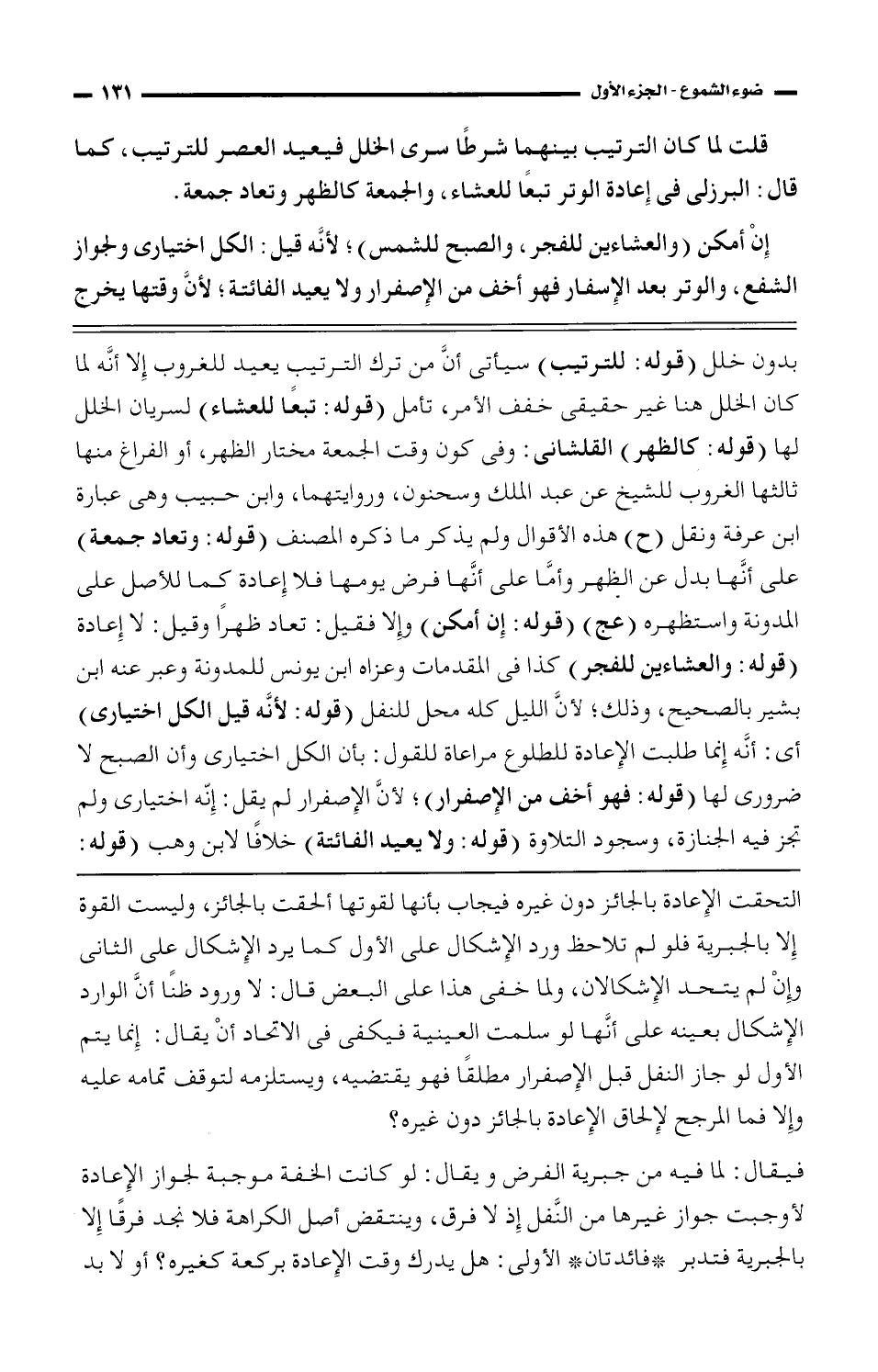 التحقت الإعادة بالجائز دون غيره فيجاب بأنها لقوتها ألحقت بالجائز، وليست القوة إلا بالجبرية فلو لم تلاحظ ورد الإشكال على الأول كما يرد الإشكال على الثاني وإن لم يتحد الإشكالان، ولما خفى هذا على البعض قال: لا ورود ظنًا أن الوارد الإشكال بعينه على أنها لو سلمت العينية فيكفى فى الاتحاد أن يقال: إنما يتم الأول لو جاز النفل قبل الاصفرار مطلقًا فهو يقتضيه، ويستلزمه لتوقف تمامه عليه وإلا فما المرجح لإلحاق الإعادة بالجائز دون غيره؟