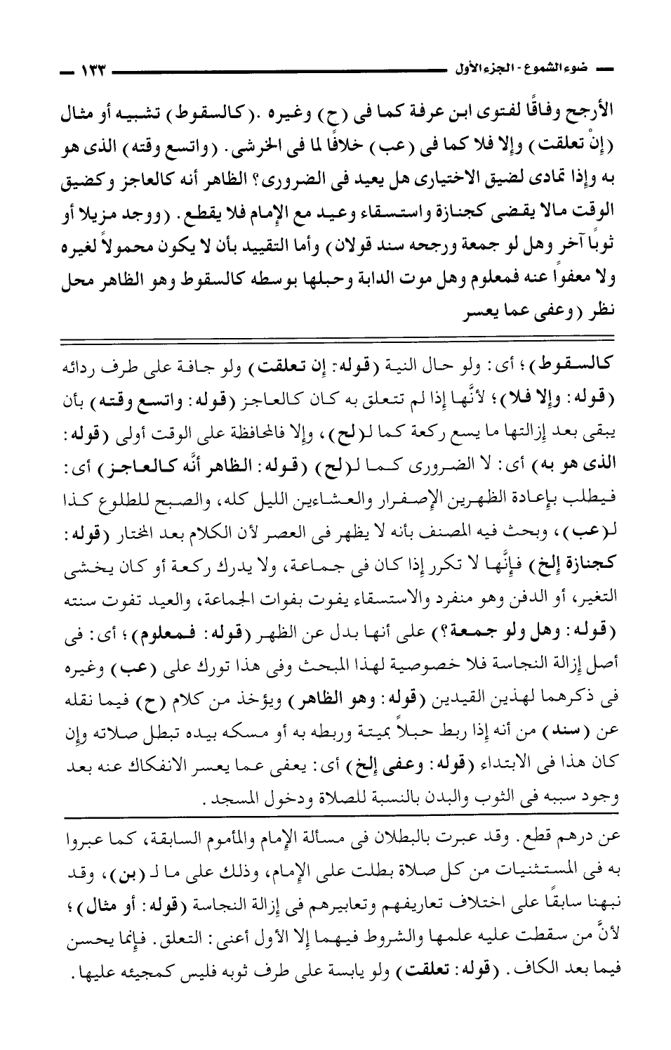 الأرجح وفاقًا لفتوى ابن عرفة كما فى (ح) وغيره. (كالسقوط) تشبيه أو مثال (إن تعلقت) وإلا فلا كما فى (عب) خلافًا لما فى الخرشى. (واتسع وقته) الذى هو به وإذا تمادى لضيق الاختيارى هل يعيد فى الضرورى؟ الظاهر أنه كالعاجز وكضيق الوقت مالا يقضى كجنازة واستقساء وعيد مع الإمام فلا يقطع. (ووجد مزيلًا أو ثوبًا آخر وهل لو جمعة ورجحه سند قولان) وأما التقييد بأن لا يكون محمولًا لغيره ولا معفوًا عنه فمعلوم وهل موت الدابة وحبلها بوسطه كالسقوط وهو الظاهر محل نظر (وعفى عما يعسر