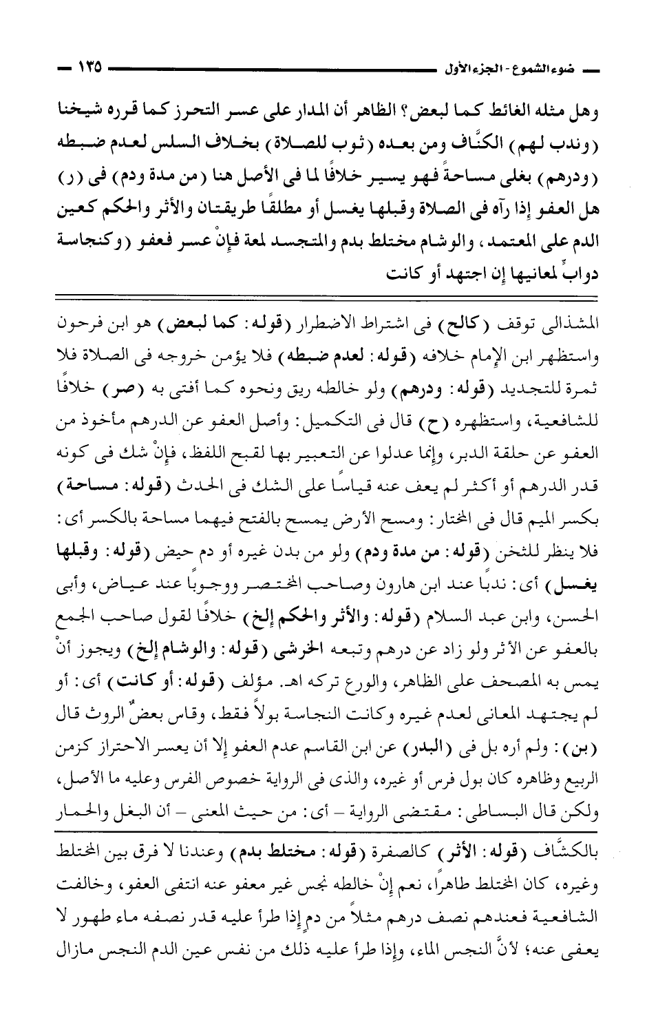 المشذالي توقف (كالح) في اشتراط الاضطرار (قوله: كما لبعض) هو ابن فرحون واستظهر ابن الإمام خلافه (قوله: لعد ضبطه) فلا يؤمن خروجه في الصلاة فلا ثمرة للتجديد (قوله: درهم) ولو خالطه ريق نحوه كما أفتى به (صر) خلافًا للشافعية، واستظهره (ح) قال في التكميل: وأصل العفو عن الدرهم مأخوذ من العفو عن حلقة الدبر، وإنما عدلوا عن التعبير بها لقبح اللفظ، فإن شك في كونه قدر الدرهم أو أكثر لم يعف عنه قياسًا على الشك في الحدث (قوله: مساحة) بكسر الميم قال في المختار: ومسح الأرض يمسح بالفتح فيهما مساحة بالكسر أي: فلا ينظر للثخن (قوله: من مدة ودم) ولو من بدن غيره أو دم حيض (قوله: وقبلها يغسل) أي: ندبًا عند ابن هارون وصاحب المختصر ووجوبًا عند عياض، وأبي الحسن، وابن عبد السلام (قوله: والأثر والحكم إلخ) خلافًا لقول صاحب الجمع بالعفو عن الأثر ولو زاد عن درهم وتبعه الخرشي (قوله: والوشام إلخ) ويجوز أن يمس به المصحف على الظاهر، والورع تركه اهـ. مؤلف (قوله: أو كانت) أي: أو لم يجتهد المعاني لعدم غيره وكانت النجاسة بولًا فقط، وقاس بعض الروث قال (بن): ولم أره بل في (البدر) عن ابن القاسم عدم العفو إلا أن يعسر الاحتراز كزمن الربيع وظاهره كان بول فرسٍ أو غيره، والذي في الرواية خصوص الفرس وعليه ما الأصل، ولكن قال البساطي: مقتضى الرواية- أي: من حيث المعنى- أن البغل والحمار