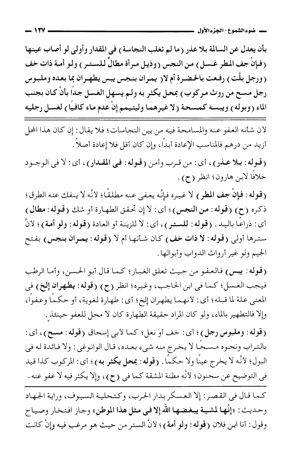 (قوله: فإن جف المطر) لا غيره فإنَّه يعفى عنه مطلقًا؛ لأنَّه لا ينفك عنه الطرق؛ ذكره (ح) (قوله: من النجس)؛ أي: لا عن تحقق الطهارة أو شك (قوله: مطال) أي: ذراعًا باليد. (قوله: للستر)، أي: لا للزينة أو العادة (قوله: ولو أمة)؛ لأنَّ سترها أولى (قوله: لا ذات خف) كان شأنها أم لا (قوله: يمران بنجس) بفتح الجيم ولو غير أرواث الدواب وأبوالها.