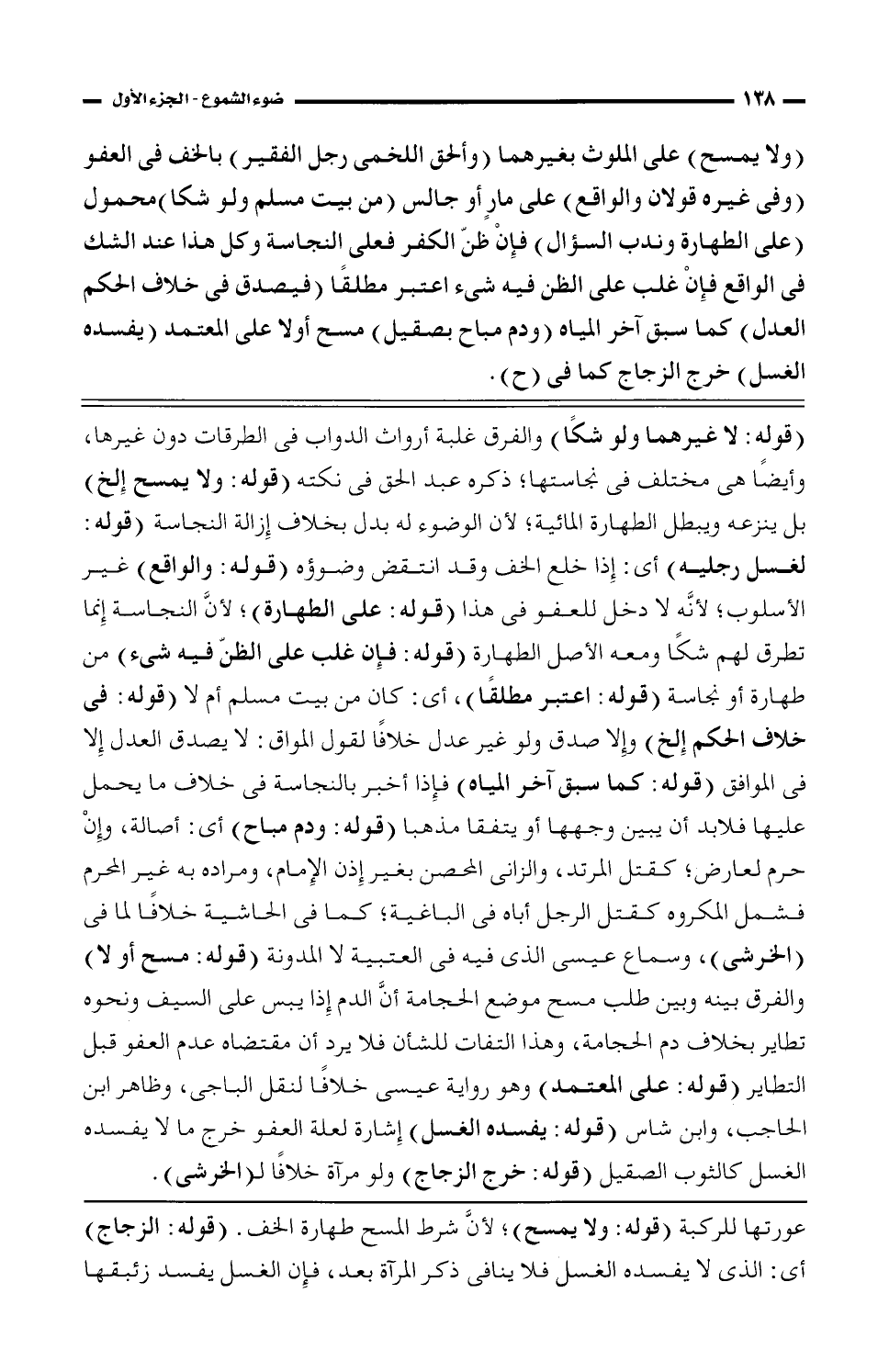 (ولا يمسح) على الملوث بغيرهما (وألحق اللخمي رجل الفقير) بالخف في العفو (وفي غيره قولان والواقع) على مارٍ أو جالس (من بيت مسلم ولو شكا) محمول (على الطهارة وندب السؤال) فإن ظن الكفر فعلى النجاسة وكل هذا عند الشك في الواقع فإن غلب على الظن فيه شيء اعتبر مطلقًا (فيصدق في خلاف الحكم العدل) كما سبق آخر المياه (ودم مباح بصقيل) مسح أولًا على المعتمد (يفسده الغسل) خرج الزجاج كما في (ح).