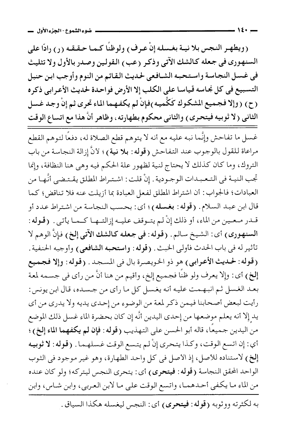 غسل ما تفاحش وإنما نبه عليه مع أنه لا يتوهم قطع الصلاة له، دفعًا لتوهم القطع مراعاةً للقول بالوجوب عند التفاحش (قوله: بلا نية)؛ لأنَّ إزالة النجاسة من باب التروك، وما كان كذلك لا يحتاج لنية الظهور علة الحكم فيه وهي هنا النظافة، وإنما تجب النية في التعبدات الوجدية. إن قلت: اشتراط المطلق يقتضي أنها من العبادات؛ فالجواب: أن اشتراط المطلق لفعل العبادة بما أزيلت عنه فلا تناقض؛ كما قال ابن عبد السلام. (قوله: بغسله)؛ أي: بحسب النجاسة من اشتراط عددٍ أو قدرٍ معينٍ من الماء، أو ذلك إن لم يتوقف عليه إزالتها كما يأتي. (قوله: السنهوري) أي: الشيخ سالم. (قوله: في جعله كالشك الآتي إلخ) فإنَّ الوهم لا تأثير له في باب الحدث فأولى الخبث. (قوله: واستحبه الشافعي) وأوجبه الحنفية. (قوله: لحديث الأعرابي) هو ذو الخويصرة بال في المسجد. (قوله: وإلا فجميع إلخ) أي: وإلا يعرف ولو ظنًا فجميع إلخ، وأقيم من هنا أنَّ من رأى في جسمه لمعةً بعد الغسل ثم انبهمت عليه أنه يغسل كل ما رأى من جسده، قال ابن يونس: رأيت لبعض أصحابنا فيمن ذكر لمعةً من الوضوء من إحدى يديه ولا يدري من أي يد إلا أنه يعلم موضعها من إحدى اليدين أنَّه إن كان بحضرة الماء غسل ذلك الموضع من اليدين جميعًا، قاله أبو الحسن على التهذيب (قوله: فإن لم يكفهما الماء إلخ)؛ أي: إن اتسع الوقت، وكذا يتحرى إن لم يتسع الوقت غسلهما. (قوله: لا ثوبيه إلخ) لاستناده للأصل، إذ الأصل في كل واحد الطهارة، وهو غير موجود في الثوب الواحد المحقق النجاسة (قوله: فيتحرى) أي: يتحرى النجس ليتركه؛ ولو كان عنده من الماء ما يكفي أحدهما، واتسع الوقت على ما لابن العربي، وابن شاس، وابن
