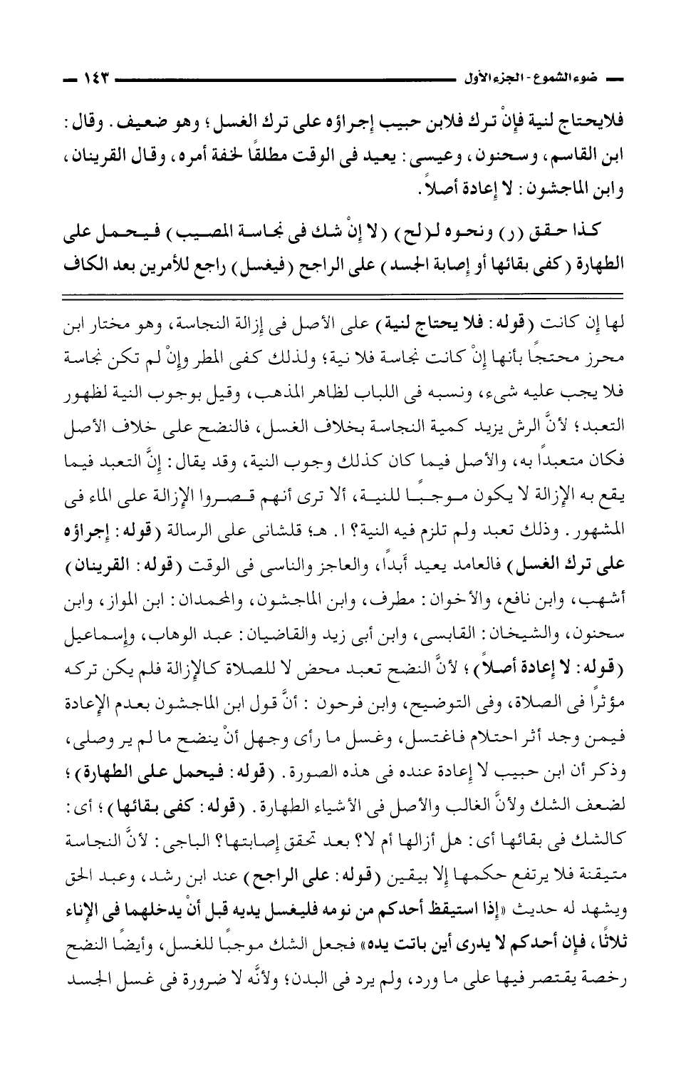 سطحه مظنة نيله لها إن كانت (قوله: فلا يحتاج لنية) على الأصل في إزالة النجاسة، وهو مختار ابن محرز محتجًا بأنها إن كانت نجاسة فلا نية؛ ولذلك كفل المطر وإن لم تكن نجاسة فلا يجب عليه شيء، ونسبه في اللباب لظاهر المذهب، وقيل بوجوب النية لظهور التعبد؛ لأنَّ الرش يزيد كمية النجاسة بخلاف الغسل، فالنضج على خلاف الأصل فكان متعبدًا به، والأصل فيما كان كذلك وجوب النية، وقد يقال: إنَّ التعبد فيما يقع به الإزالة لا يكون موجبًا للنية، ألا ترى أنهم قصروا الإزالة على الماء في المشهور. وذلك تعبد ولم تلزم فيه النية؟ ا. هـ؛ قلشاني على الرسالة (قوله: إجراؤه على ترك الغسل) فالعامد يعيد أبدًا، العاجز والناسي في الوقت (قوله: القرينان) أشهب، وابن نافع، والأخوان: مطرف، وابن الماجشون، والمحمدان: ابن الموازن وابن سحنون، والشيخان: القاسي، وابن أبي زيد والقاضيان: عبد الوهاب، وإسماعيل (قوله: لا إعادة أصلًا)؛ لأنَّ النضح تعبد محض لا للصلاة كالإزالة فلم يكن تركه مؤثرًا في الصلاة، وفي التوضيح، وابن فرحون: أنَّ قول ابن الماجشون بعدم الإعادة فيمن وجد أثر احتلام فاغتسل، وغسل ما رأى وجهل أن ينضح ما لم ير وصلى، وذكر ان ابن حبيب لا غعادة عنده في هذه الصورة. (قوله: فيحمل على الطهارة)؛ لضعف الشك ولأنَّ الغالب والأصل في الأشياء الطهارة. (قوله: كفى بقائها)؛ أي: كالشك في بقائها أي: هل أزالها أم لا؟ بعد تحقق إصابتها؟ الباجي: لأنَّ النجاسة متيقنة فلا يرتفع حكمها إلا بيقين (قوله: على الراجح) عند ابن رشد، وعبد الحق ويشهد له حديث "إذا استيقظ أحدكم من نومه فليغسل يديه قبل أن يدخلهما في الإناء ثلاثًا، فإن أحدكم لا يدري أين باتت يده" فجعل الشك موجبًا للغسل، وأيضًا النضح رخصة يقتصر فيها على ما ورد، ولم يرد في البدن؛ ولأنَّه لا ضرورة في غسل الجسد (قوله:
