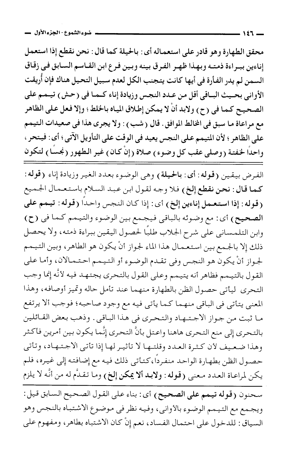 محقق الطهارة وهو قادر على استعماله أي: بالحيلة كما قال: نحن نقطع إذا استعمل إناءين ببراءة ذمته وبهذا ظهر الفرق بينه وبين فرع ابن القاسم السابق في زقاق السمن لم يدر الفأرة في أيها كانت يتجنب الكل لعدم سبيل التحيل هناك فإن أرقت الأواني بحيث الباقي أقل من عد النجس وزيادة إناء كما في (حش) تيمم على الصحيح كما في (ح) ولابد أن لا يمكن إطلاق المياه بالخلط؛ وإلا فعل على الظاهر مع مراعاة ما سبق في المخالط الموافق. قال (شب): ولا يجري هذا في صعيدات التيمم على الظاهر؛ لأن المتيمم على النجس يعيد في الوقت على التأويل الآتي؛ أي: فيتحر، واحدًا لخفته (وصلى عقب كل وضوء) صلاة (إن كان) غير الطهور (نجسًا) لتكون