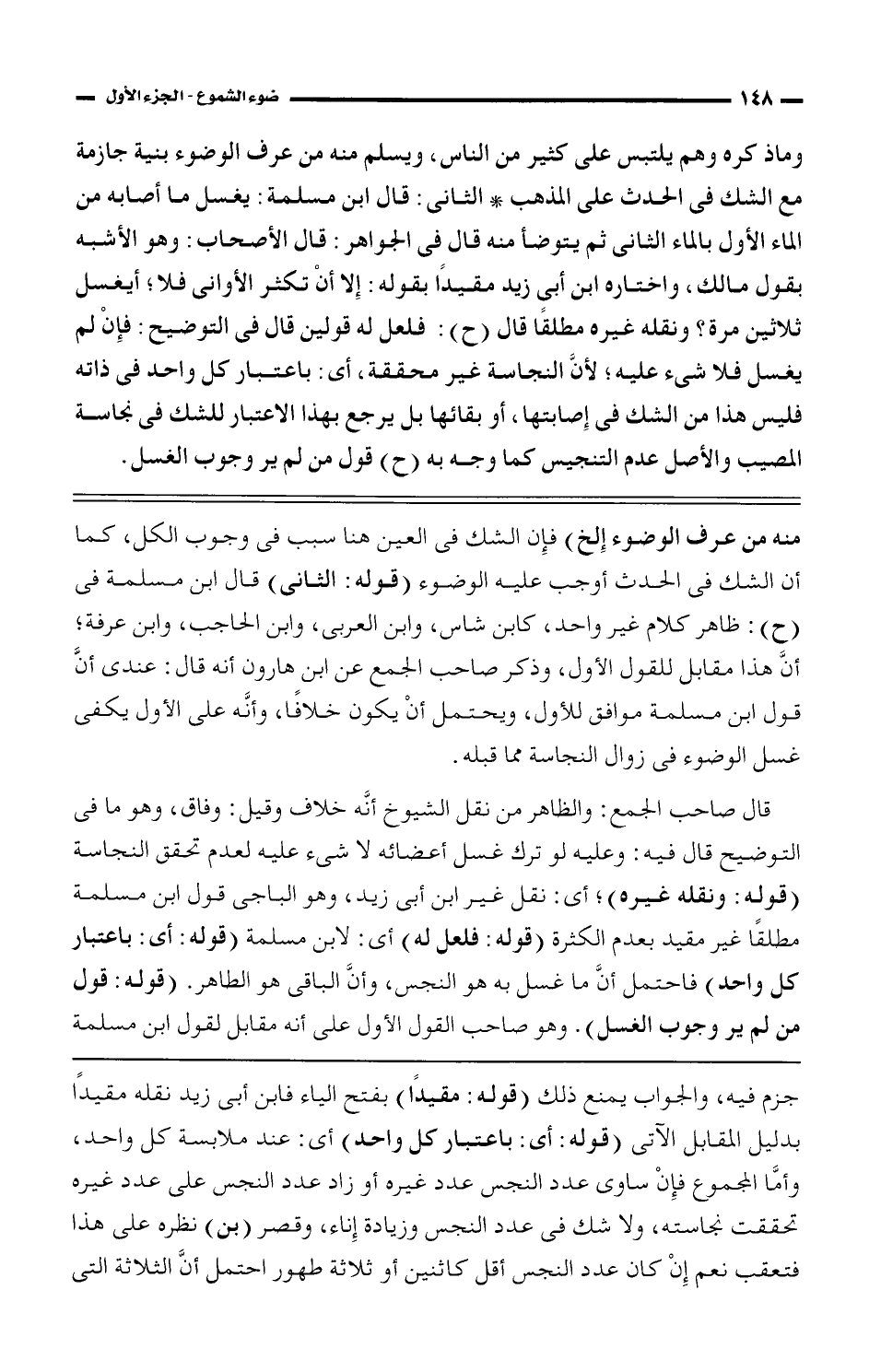 وما ذكره وهم يتلبس على كثيرٍ من الناس، ويسلم منه من عرف الوضوء بنيةٍ جازمة مع الشك في الحدث على المذهب* الثاني: قال ابن مسلمة: يغسل ما أصابه من الماء الأول بالماء الثاني ثم يتوضأ منه قال في الجواهر: قال الأصحاب: وهو الشبه بقول مالك، واختاره ابن أبي زيد مقيدًا بقوله: إلا أن تكثر الأواني فلا؛ أيغسل ثلاثين مرة؟ ونقله غيره مطلقًا قال (ح): فلعل له قولين قال في التوضيح: فإن لم يغسل فلا شيء عليه؛ لأنَّ النجاسة غير محققة، أبي: باعتبار كل واحدٍ في ذاته فليس هذا من الشك في إصابتها، أو بقائها بل يرجع بهذا الاعتبار للشك في نجاسة المصيب والأصل عدم التنجيس كما وجه به (ح) قول من لم ير وجوب الغسل.