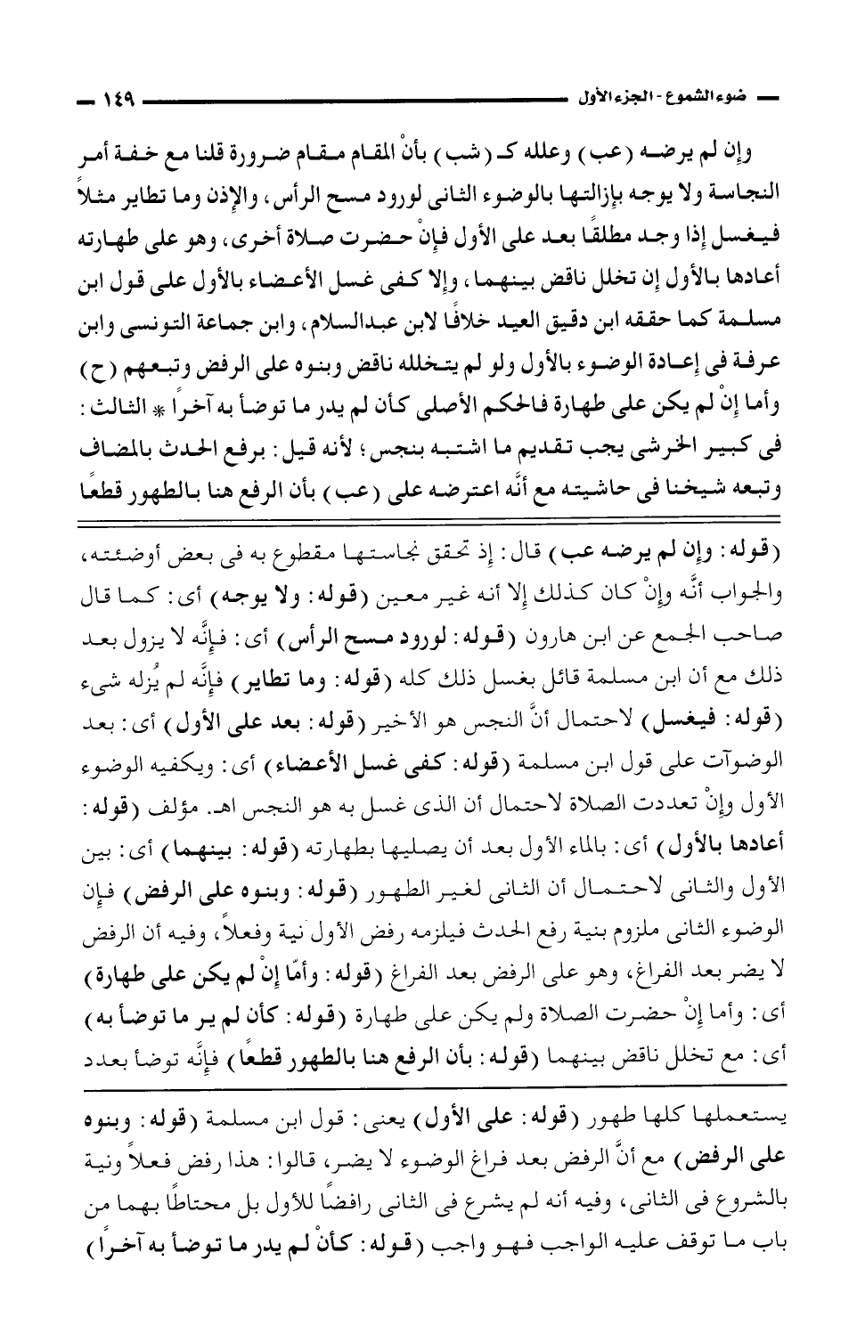 وإن لم يرضه (عب) وعلله كـ (شب) بأن المقام مقام ضرورة قلنا مع خفة أمر النجاسة ولا يوجه بإزالتها بالوضوء الثاني لورود مسح الرأس، والإذن وما تطاير مثلًا فيغسل إذا وجد مطلقًا بعد على الأول فإن حضرت صلاة أخرى، وهو على طهارته أعادها بالأول إن تخلل ناقص بينهما، وإلا كفى غسل الأعضاء بالأول على قول ابن مسلمة كما حققه ابن دقين العيد خلافًا لابن عبد السلام، وابن جماعة التونسي وابن عرفة في إعادة الوضوء بالأول ولو لم يتخلله ناقض وبنوه على الرفض وتبعهم (ح) وأما إن لم يكن على طهارة فالحكم الأصلي كأن لم يدر ما توضأ به آخرًا* الثالث: في كبير الخرشي يجب تقديم ما اشتبه بنجس؛ لأنه قيل: برفع الحدث بالمضاف وتبعه شيخنا في حاشيته مع أنَّه اعترضه على (عب) بأن الرفع هنا بالطهور قطعًا