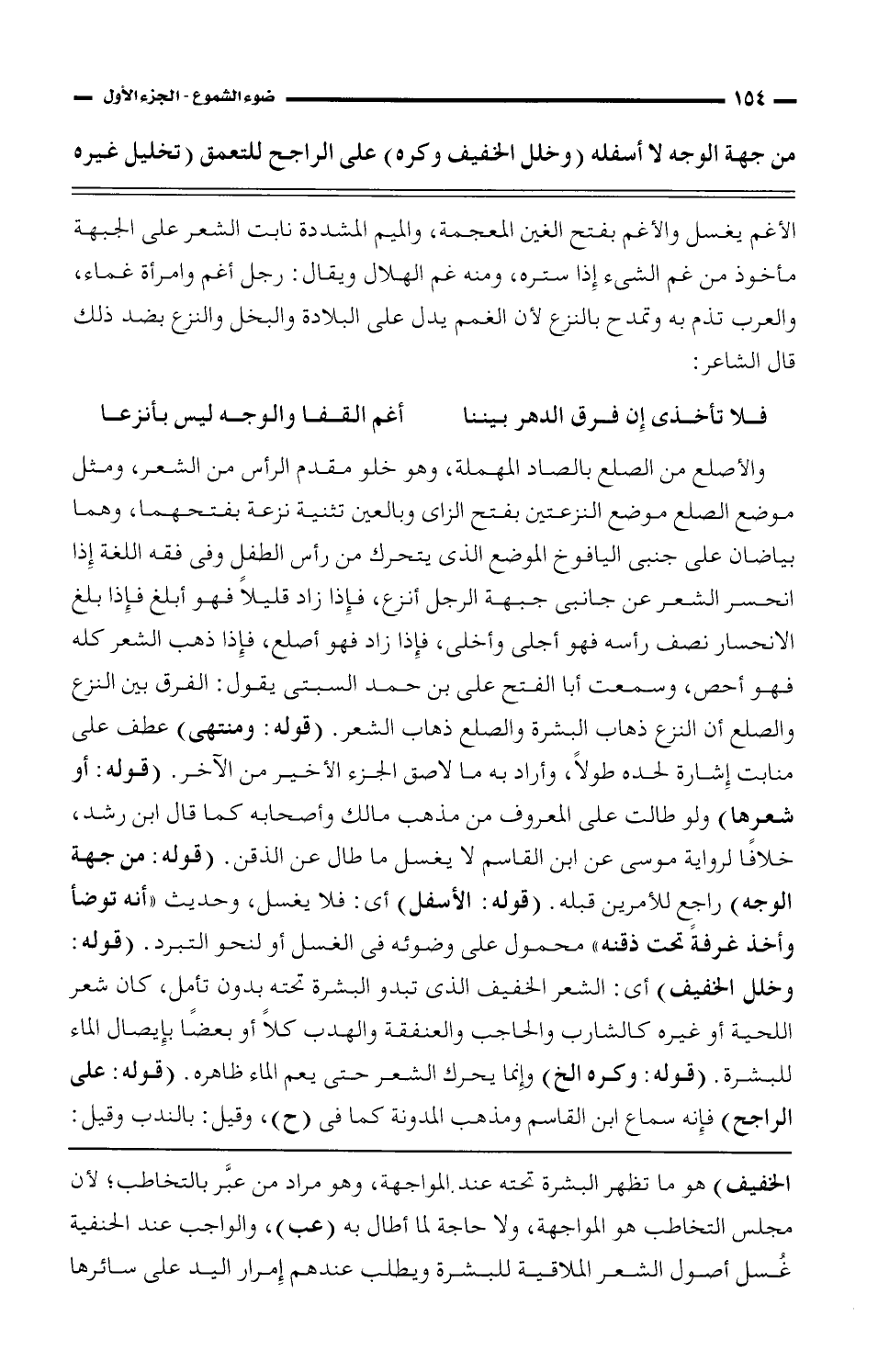 والأصلع من الصلع بالصاد المهملة، وهو خلو مقدم الرأس من الشعر، ومثل موضع الصلع موضع النزعتين بفتح الزاي وبالعين تثنية نزعة بفتحهما، وهما بياضان على جنبي اليافوخ الموضع الذي يتحرك من رأس الطفل وفي فقه اللغة: إذا انحسر الشعر عن جانبي جبهة الرجل أنزع، فإذا زاد قليلًا فهو أبلغ فإذا بلغ الانحسار نصف رأسه فهو أجلى وأخلى، فإذا زاد فهو أصلع، فإذا ذهب الشعر كله فهو أحص، وسمعت أبا الفتح على بن حمد السبتى يقول: الفرق بين النزع والصلع أن النزع ذهاب البشرة والصلع ذهاب الشعر. (قوله: ومنهي) عطف على منابت إشارة لحده طولًا، وأراد به ما لاصق الجزء الأخير من الآخر. (قوله: أو شعرها) ولو طالت على المعروف من مذهب مالك وأصحابه كما قال ابن رشد، خلافًا لرواية موسى عن ابن القاسم لا يغسل ما طال عن الذقن. (قوله: من جهة الوجه) راجع للأمرين قبله. (قوله: الأسفل) أي: فلا يغسل، وحديث "أنه توضأ وأخذ غرفة تحت ذقنه" محمول على وضوئه في الغسل أو لنحو التبرد. (قوله: وخلل الخفيف) أي: الشعر الخفيف الذي تبدو البشرة تحته بدون تأمل، كان شعر اللحية أو غيره كالشارب والحاجب والعنفقة والهدب كلًا أو بعضًا بإيصال الماء للبشرة. (قوله: وكره الخ) وإنما يحرك الشعر حتى يعم الماء ظاهره. (قوله: على الراجح) فإنه سماع ابن القاسم ومذهب المدونة كما في (ح)، وقيل: بالندب وقيل: