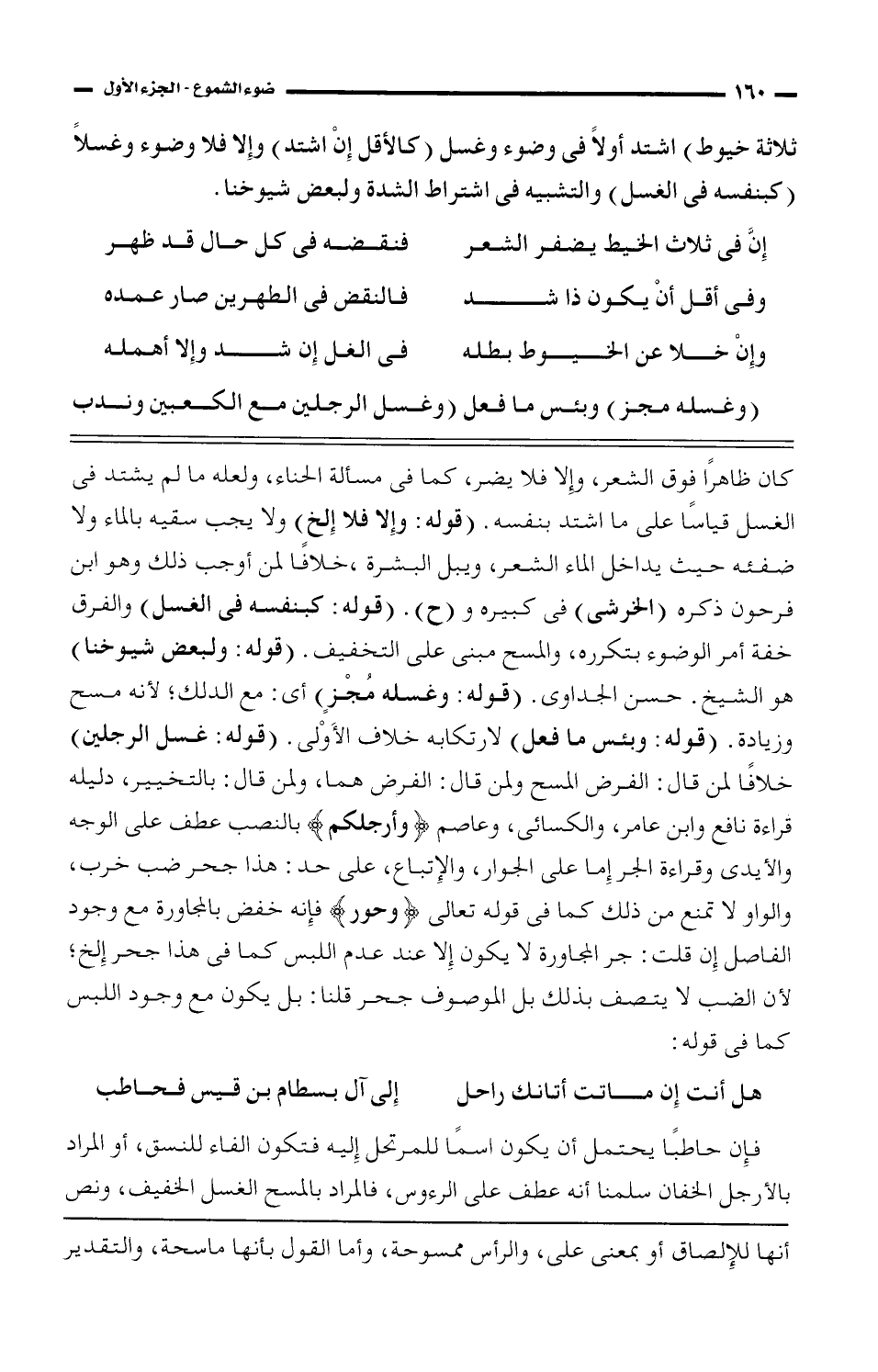 كان ظاهرًا فوق الشعر، وإلا فلا يضر، كما في مسألة الحناء، ولعله ما لم يشتد في الغسل قياسًا على ما اشتد بنفسه. (قوله: وإلا فلا الخ) ولا يجب سقيه بالماء ولا ضفئه حيث يداخل الماء الشعر، ويبل البشرة، خلافًا لمن أوجب ذلك وهو ابن فرحون ذكره (الخرشى) في كبيره و (ح). (قوله: كبنفسه في الغسل) والفرق خفة أمر الوضوء بتكرره، والمسح مبنى على التخفيف. (قوله: ولبعض شيوخنا) هو الشيخ. حسن الجداوي. (قوله: وغسله مجز) أي: مع الدلك؛ لأنه مسح وزيادة. (قوله: وبئس ما فعل) لارتكابه خلاف الأولى. (قوله: غسل الرجلين) خلافًا لمن قال: الفرض المسح ولمن قال: الفرض هما، ولمن قال: بالتخيير، دليله قراءة نافع وابن عامر، والكسائي، وعاصم {وأرجلكم} بالنصب عطف على الوجه والأيدي وقراءة الجر إما على الجوار، والإتباع، على حد: هذا جحر ضب خرب، والواو لا تمنع من ذلك كما في قوله تعالى: {وحور} فإنه خفض بالمجاورة مع وجود الفاصل إن قلت: جر المجاورة لا يكون إلا عند عدم اللبس كما في هذا جحر الخ؛ لأن الضب لا يتصف بذلك بل الموصوف جحر قلنا: بل يكون مع وجود اللبس كما في قوله: