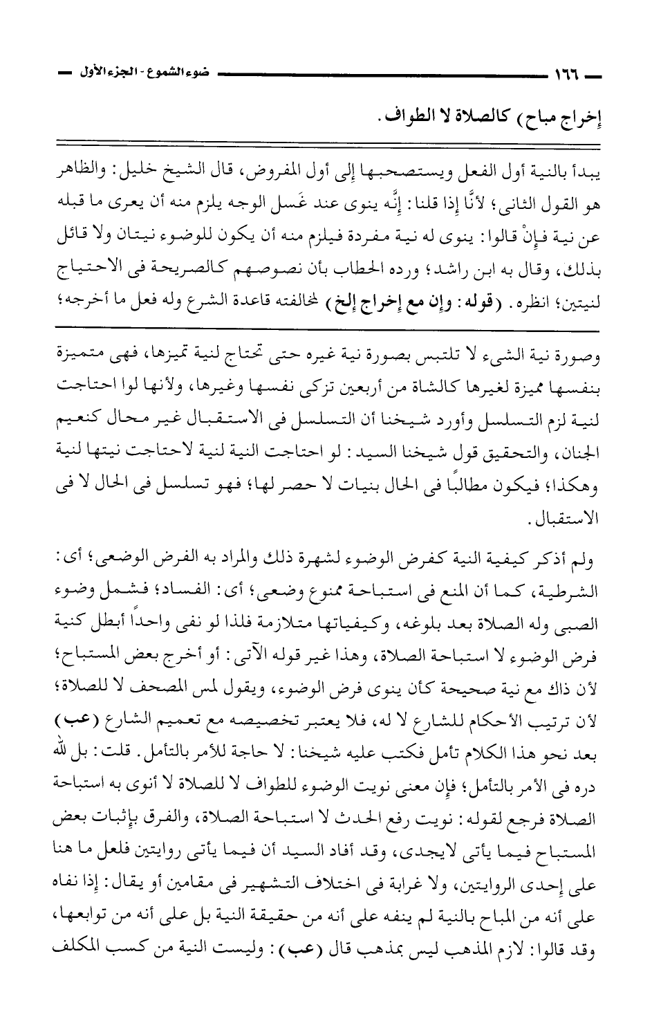 وصورة نية الشيء لا تلتبس بصورة نية غيره حتى تحتاج لنية تميزها، فهي متميزة بنفسها مميزة لغيرها كالشاة من أربعين تزكى نفسها وغيرها، ولأنها لوا احتاجت لنية لزم التسلسل وأورد شيخنا أن التسلسل في الاستقبال غير محال كنعيم الجنان، والتحقيق قول شيخنا السيد: لو احتاجت النية لنية لاحتاجت نيتها لنية وهكذا؛ فيكون مطالبًا في الحال بنيات لا حصر لها؛ فهو تسلسل في الحال لا في الاستقبال.