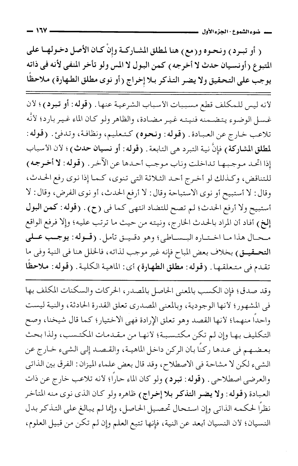 وقد صدق؛ فإن الكسب بالمعنى الحاصل بالمصدر، الحركات والسكنات المكلف بها في المشهور؛ لأنها الوجودية، وبالمعنى المصدري تعلق القدرة الحادثة، والنية ليست واحدًا منهما؛ لأنها القصد وهو تعلق الإرادة فهي الاختيار؛ كما قال شيخنا، وصح التكليف بها وإن لم تكن مكتسبة؛ لأنها من مقدمات المكتسب، ولذا بحث بعضهم في عدها ركنًا بأن الركن داخل الماهية، والقصد إلى الشيء خارج عن الشيء لكن لا مشاحة في الاصطلاح، وقد قال بعض علماء الميزان: الفرق بين الذاتي والعرض اصطلاحي. (قوله: تبرد) ولو كان الماء حارًا؛ لأنه تلاعب خارج عن ذات العبادة (قوله: ولا يضر التذكر بلا إخراج) ظاهره ولو كان الذي نوى منه المتأخر نظرًا لحكمه الذاتي وإن استحال تحصيل الحاصل، وإنما لم يبالغ على التذكر بدل النسيان؛ لأن النسيان أبعد عن النية، فإنها تتبع العلم وإن لم تكن من قبيل العلوم،