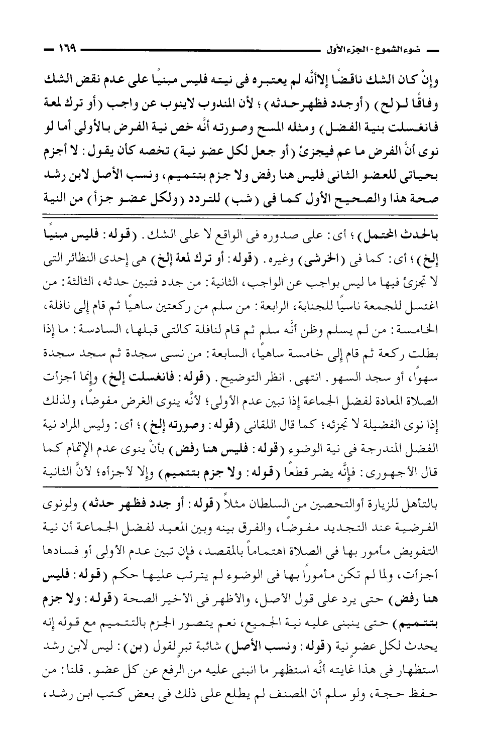 للزيارة أو التحصين من السلطان مثلًا (قوله: أو جدد فظهر حدثه) ولو نوى الفرضية عند التجديد مفوضًا، والفرق بينه وبين المعيد لفضل الجماعة أن نية التفويض مأمور بها في الصلاة اهتمامًا بالمقصد، فإن تبين عدم الأولى أو فسادها أجزأت، ولما لم تكن مأمورًا بها في الوضوء لم يترتب عليها حكم (قوله: فليس هنا رفض) حتى يرد على قول الأصل، والأظهر في الأخير الصحة (قوله: ولا جزم بتتميم) حتى ينبني عليه نية الجميع، نعم يتصور الجزم بالتتميم مع قوله إنه يحدث لكل عضو نية (قوله: ونسب الأصل) شائبة تبر لقول (بن): ليس لابن رشد استظهار في هذا غايته أنَّه استظهر ما انبنى عليه من الرفع عن كل عضو. قلنا: من حفظ حجة، ولو سلم أن المصنف لم يطلع على ذلك في بعض كتب ابن رشد،
