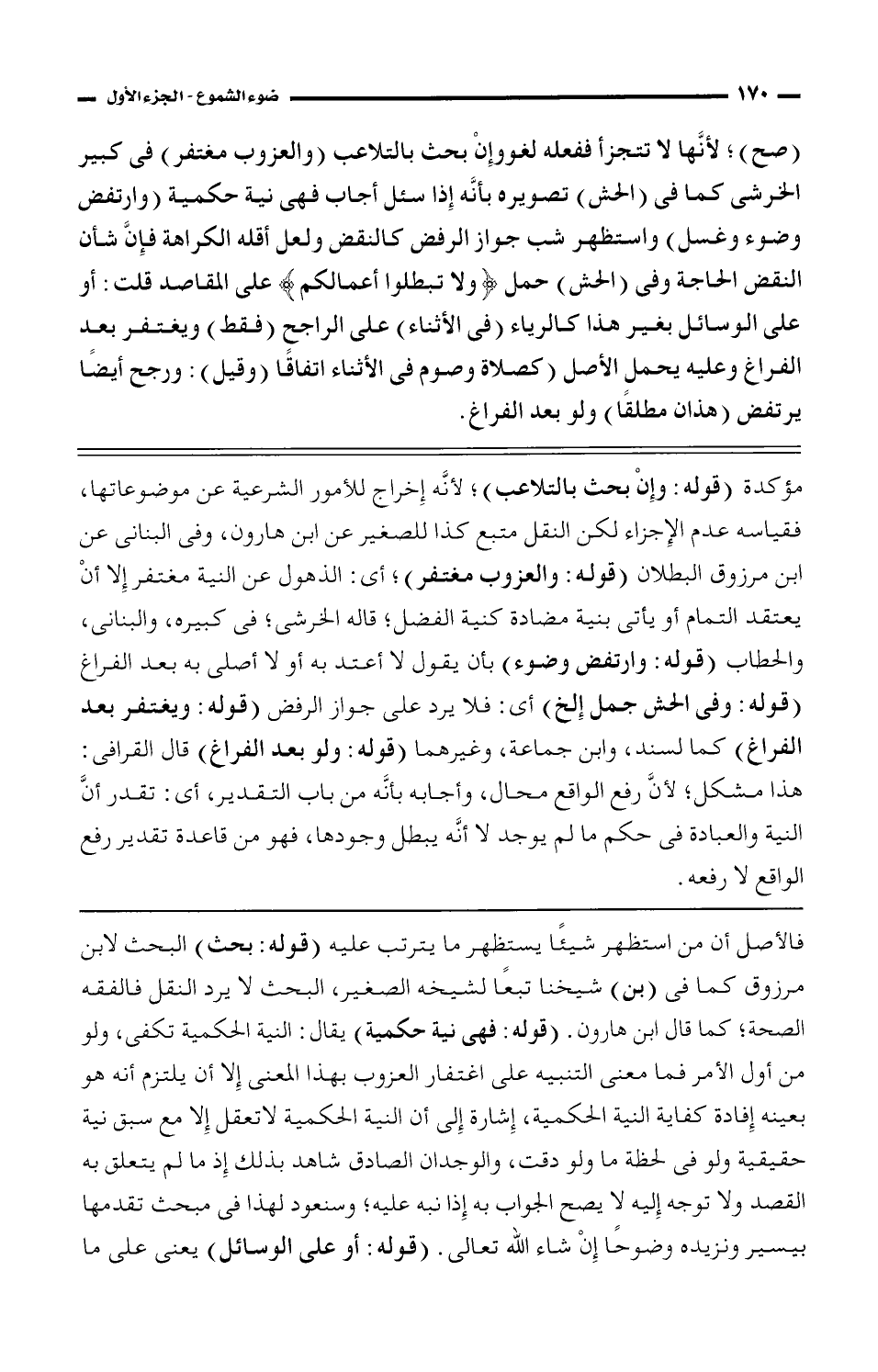 (صح)؛ لأنَّها لا تتجزأ ففعله لغو وإن بحث بالتلاعب (والعزوب مغتفر) في كبير الخرشى كما في (الحش) تصويره بأنَّه إذا سئل أجاب فهي نية حكمية (وارتفض وضوء وغسل) واستظهر شب جواز الرفض كالنقض ولعل أقله الكراهة فإنَّ شأن النقض الحاجة وفي (الحش) حمل {ولا تبطلوا أعمالكم} على المقاصد قلت: أو على الوسائل بغير هذا كالرياء (في الأثناء) على الراجح (فقط) ويغتفر بعد الفراغ وعليه يحمل الأصل (كصلاة وصوم في الأثناء اتفاقًا (وقيل): ورجح أيضًا يرتفض (هذان مطلقًا) ولو بعد الفراغ.