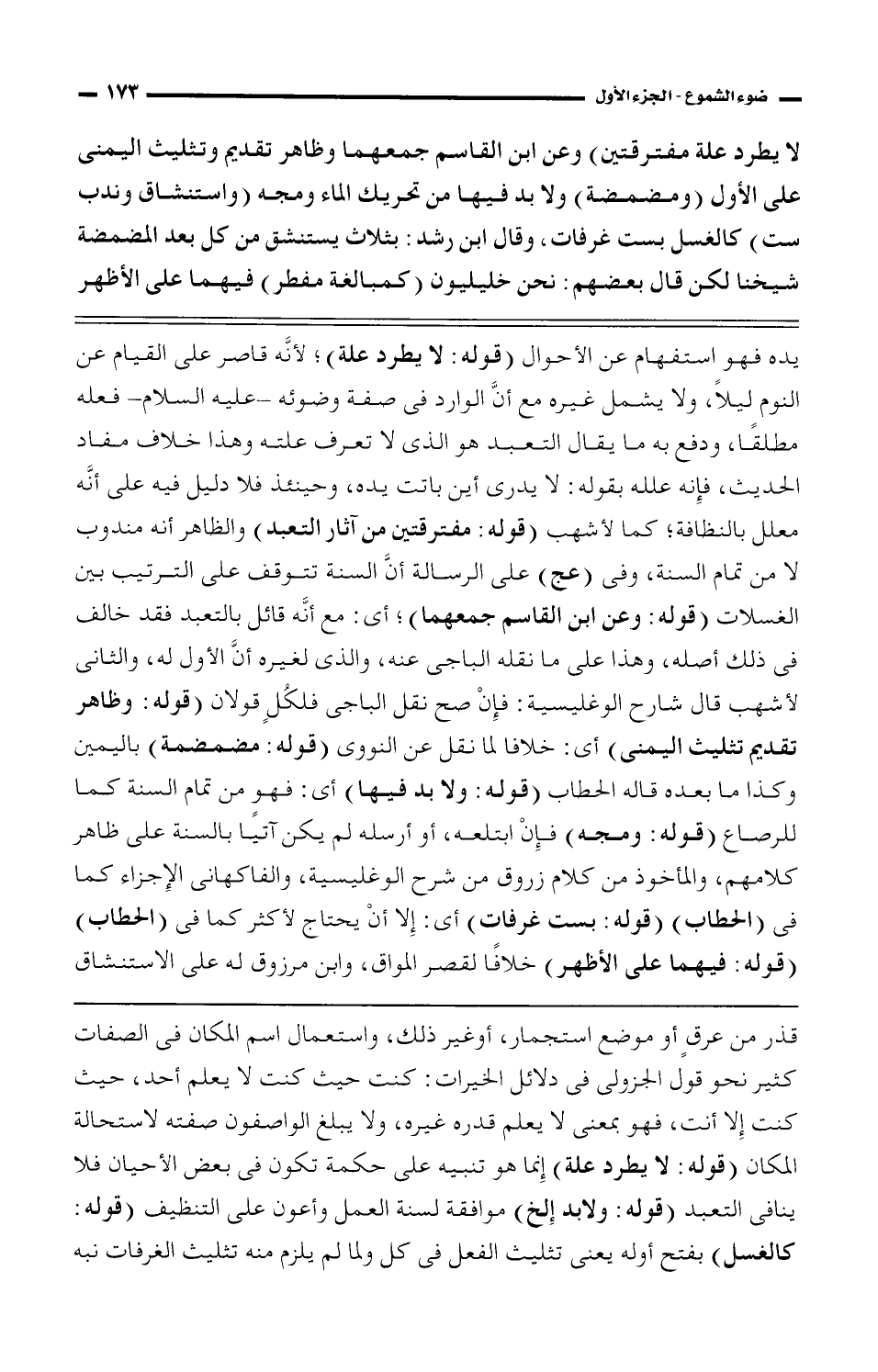 يده فهو استفهام عن الأحوال (قوله: لا يطرد علة)؛ لأنَّه قاصر على القيام عن النوم ليلًا، ولا يشمل غيره مع أنَّ الوارد في صفة وضوئه- عليه السلا- فعله مطلقًا، ودفع به ما يقال التعبد هو الذي لا تعرف علته وهذا خلاف مفاد الحديث، فإنه علله بقوله: لا يدرى أين باتت يده، وحينئذ فلا دليل فيه على أنَّه معلل بالنظافة؛ كما لأشهب (قوله: مفترقتين من آثار التعبد) والظاهر أنه مندوب لا من تمام السنة، وفي (عج) على الرسالة أنَّ السنة تتوقف على الترتيب بين الغسلات (قوله: وعن ابن القاسم جمعهما)؛ أي: مع أنَّه قائل بالتعبد فقد خالف في ذلك أصله، وهذا على ما نقله الباجى عنه، والذي لغيره أنَّ الأول له، والثاني لأشهب قال شارح الوغليسية: فإن صح نقل الباجى فلكل قولان (قوله: وظاهر تقديم تثليث اليمنى) أي: خلافًا لما نقل عن النووي (قوله: مضمضة) باليمين وكذا ما بعده قاله الحطاب (قوله: ولابد فيها) أي: فهو من تمام السنة كما للرصاع (قوله: ومجه) فإن ابتلعه، أو أرسله لم يكن آتيًا بالسنة على ظاهر كلامهم، والمأخوذ من كلام زروق من شرح الوغليسية، والفاكهاني الإجزاء كما في (الحطاب) (قوله: بست غرفات) أي: إلا أن يحتاج لأكثر كما في (الحطاب) (قوله: فيهما على الأظهر) خلافًا لقصر المواق، وابن مرزوق له على الاستنشاق