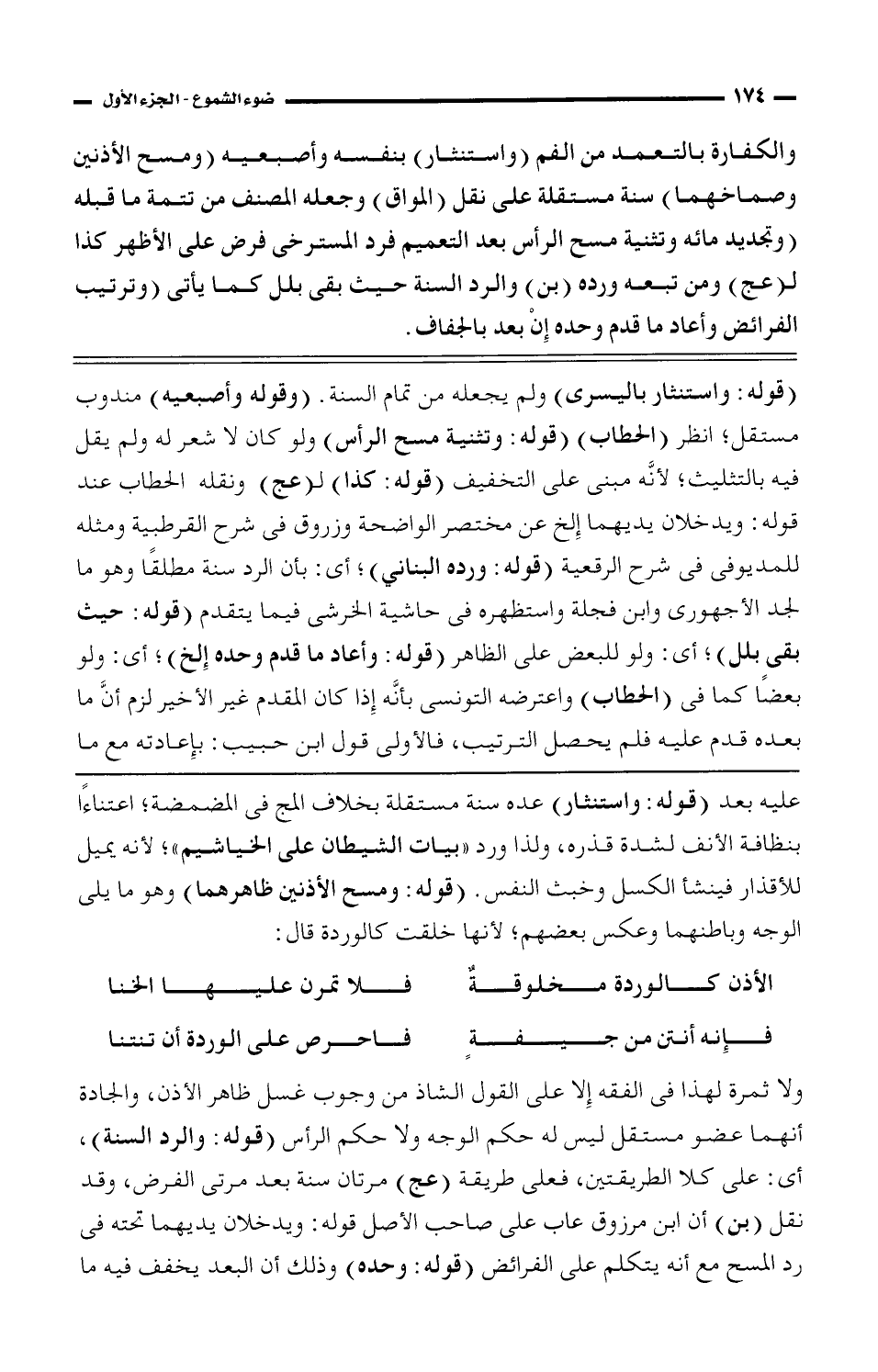 فيهما على الأظهر والكفارة بالتعمد من الفم (واستنثار) بنفسه وأصبعيه (ومسح الأذنين وصماخهما) سنة مستقلة على نقل (المواق) وجعله المنصف من تتمة ما قبله (وتجديد مائه وتثنية مسح الرأس بعد التعميم فرد المسترخى فرض على الأظهر كذا لـ (عج) ومن تبعه ورده (بن) والرد السنة حيث بقى بلل كما يأتي (وترتيب الفرائض وأعاد ما قدم وحده إن بعد بالجفاف.