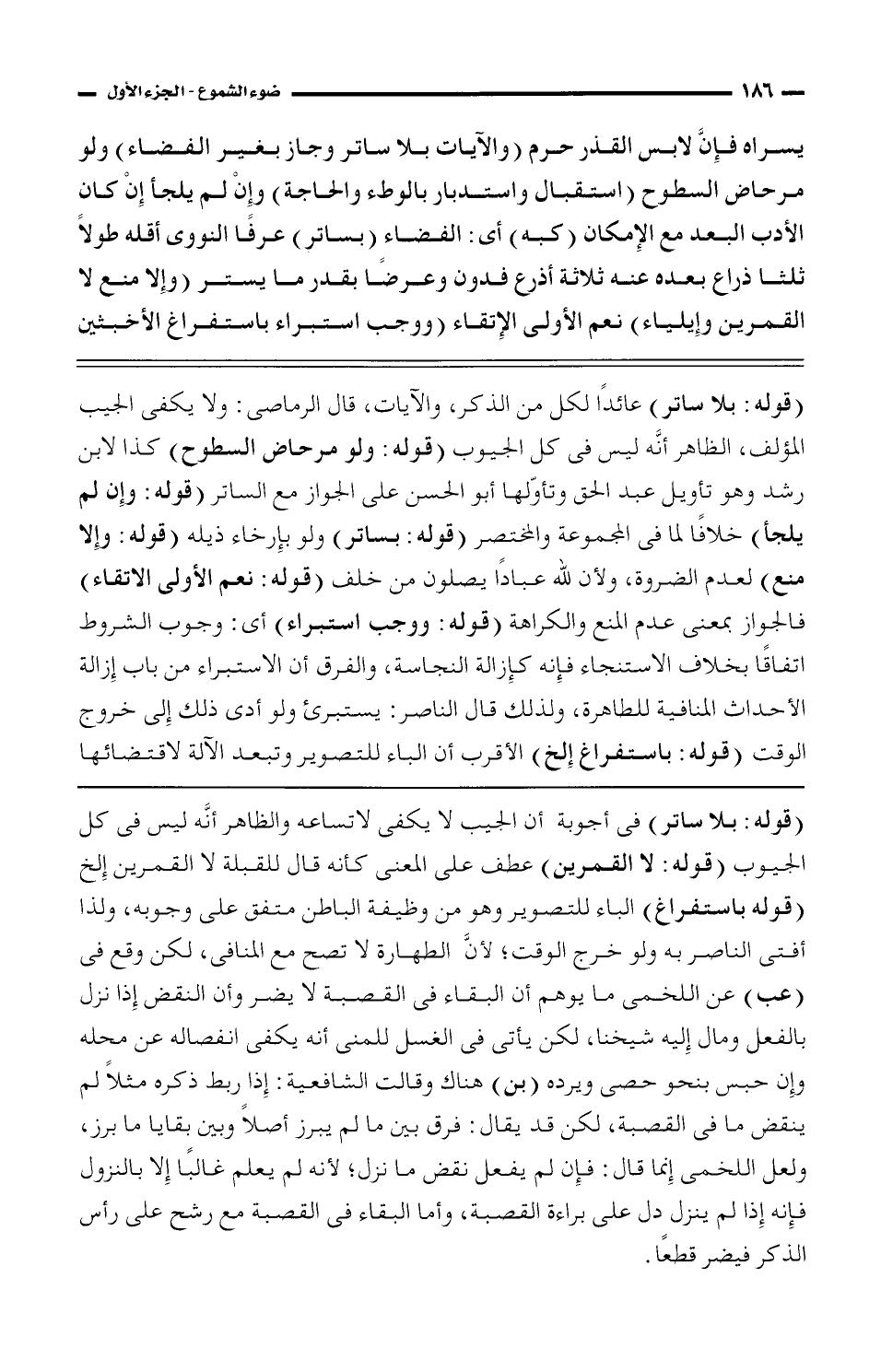 (قوله: بلا ساتر) ف سأجوبة أن الجيب لا يكفي لاتساعه والظاهر أنَّه ليس في كل الجيوب (قوله: لا القمرين) عطف على المعنى كأنه قال للقبلة لا القمرين إلخ (قوله باستفراغ) الباء للتصوير وهو من وظيفة الباطن متفق على وجوبه، ولذا أفت الناصر به ولو خرج الوقت؛ لأنَّ الطهارة لا تصح مع المنافي، لكن وقع في (عب) عن اللخمي ما يوهم أن البقاء في القصبة لا يضر وأن النقض إذا نزل بالفعل ومال إليه شيخنا، لكن يأتي في الغسل للمنى أنه يكفي انفصاله عن محله وإن حبس بنحو حصى ويرده (بن) هناك وقالت الشافعية: إذا ربط ذكره مثلًا لم ينقض ما في القصبة، لكن قد يقال: فرق بين ما لم يبرز أصلا وبين بقايا ما برز، ولعل اللخمي إنما قال: فإن لم يفعل نقض ما نزل؛ لأنه لم يعلم غالبًا إلا بالنزول فإنه إذا لم ينزل دل على براءة القصبةن وأما البقاء في القصبة مع شح على رأس الذكر فيضر قطعًا.