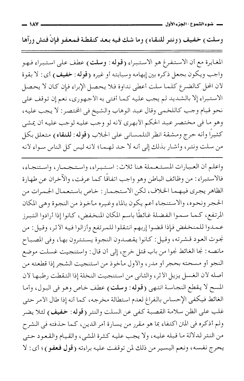 واعلم أن العبارات المستعملة هنا ثلا: استبراء، واستجما، واستنجاء، فالاستبراء: من وظائف الباطن وهو واجب اتفاقًا كما عرفت، والآخرن عن طهارة الظاهر يجرى فيهما الخلاف، لكن الاستجمار: خاص باستعمال الجمرات من الحجر ونحوه، والاستنجاء ظاعم يكون بالماء وغيره مأخوذ من النجوة وهي المكان الرتفع، كما سموا الفضلة غائطًا باسم المكان المنخفض، كانوا إذا أرادوا التبرز عمدوا للمنخفض فإذا قضوا أربهم انتقلوا للمرتفع وأزالوا فيه الأثر، وقيل: من نجوت العود قشرته، وقيل: كانوا يقصدون النجوة يستترون بها، وفي المصباح ما نصه: نجا الغائط نجوا من باب قتل خرج، إلى أن قال: واستنجيب غسلت موضع النجو أو مسحته بحجر أو مدر، والأول مأخوذ من استنجيب الشجر إذا قطعته من أصله لأن الغسل يزيل الأثر، والثاني من استنجيت النخلة إذا التقطت رطبها لأن المسح لا يقطع النجاسة انتهى (قوله: وسلت) عطف خاص وهو في البول، وأما الغائط فيكفي الإحساس بالفراغ لعدم استطالة مخرجه، كما أنه إذا طال الأمر حتى غلب على الظن سلامة القصبة كفى عن السلت والنتر (قوله: خفيف) لئلا يضر ولم أذكره في المتن اكتفاء بما هو مقرر من يسارة أمر الدين، كما حذفته ف يالشرح من النتر لدلالة ما قببله عليه، ولا يجب عليه كثرة المشي، والقيان والقعود حتى يحرج نفسهن ونعم اليسي من 1 لك لمن توقفت عليه براءته (قوله فعفو)؛ أي: لا