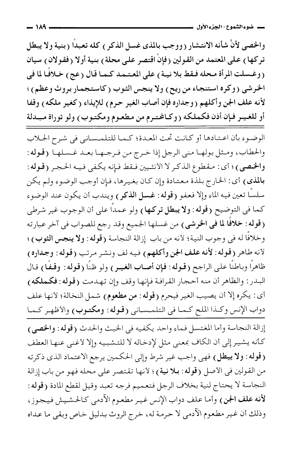 الوضوء بأن اعتادها أو كانت تحت المعدة؛ كما للتلمساني في شرح الجلاب والحطاب، ومثل بولها منى الرجل إذا خرج من فرجها بعد غسلها (قوله: والخصى)؛ أي: مقطوع الذكر لا الأنثيين فقط فإنه يكفي فيه الحجر (قولهك بالمذى) أي: الخارج بلذة معتادة وإن كان بغيرها، فإن أوجب الوضوء ولم يكن سلسًا تعين فيه الماء وإلا فعفو (قوله: غسل الذكر) ويندب أن يكون عند الوضوء كما في التوضيح (قوله: ولا يبطل تركها) ولو عمدًا على أن الوجوب غير شرطي (قوله: خلافًا لما في الخشي) من غسلها الجميع وقد رجع للصواب في آخر عبارته وخلافًا له في وجوب النية؛ لأنه من بابا إزالة النجاسة (قوله: ولا ينجس الثوب)؛ لأنه طاهر (قوله: لأنه علف الجن وأكلهم) فيه لف ونشر مرتب (قوله: وجداره) ظاهرًا وباطنًا على الراجح (قوله: فإن أصاب الغير) ولو ظنًا (قوله: وقفًا) قال البدر: والظاهر أن منه أحجار القرافة فإنها وقف وإن تهدمت (قوله: فكملكه) أي: يكره إلا أن يصيب الغير فيحم (قوله: من مطعوم) شمل النخالة؛ لأنها علف دواب الإنس وكذا الملح كما في التلمساني (قوله: ومكتوب) والأظهر كما
