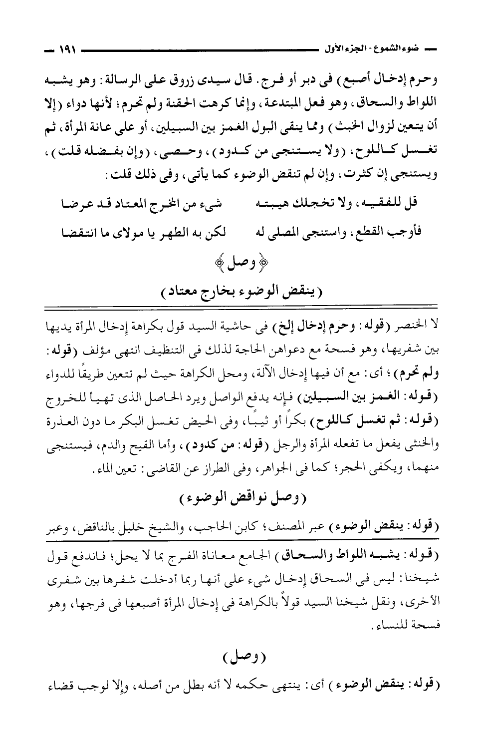 وحرم إدخال أصبع) في دبر أو فرج. قال سيدي زوق على الرسالة: وهو يسبه اللواط والسحاق، وهو فعل المبتدعة، وإنما كرهت الحقنة ولم تحرم؛ لأنها دواء (إلا ان يتعين لزوال الخبث) ومما ينقى البول الغمز بين السبيلين، أو على عانة المرأة، ثم تغسل كاللوح، (ولا يستنجى من كدود)، وحصى، (وإن بفضله قلت)، ويستنجي إن كثرت، وإن لم تنقض الوضوء كما يأتي، وفي ذلك قلت: