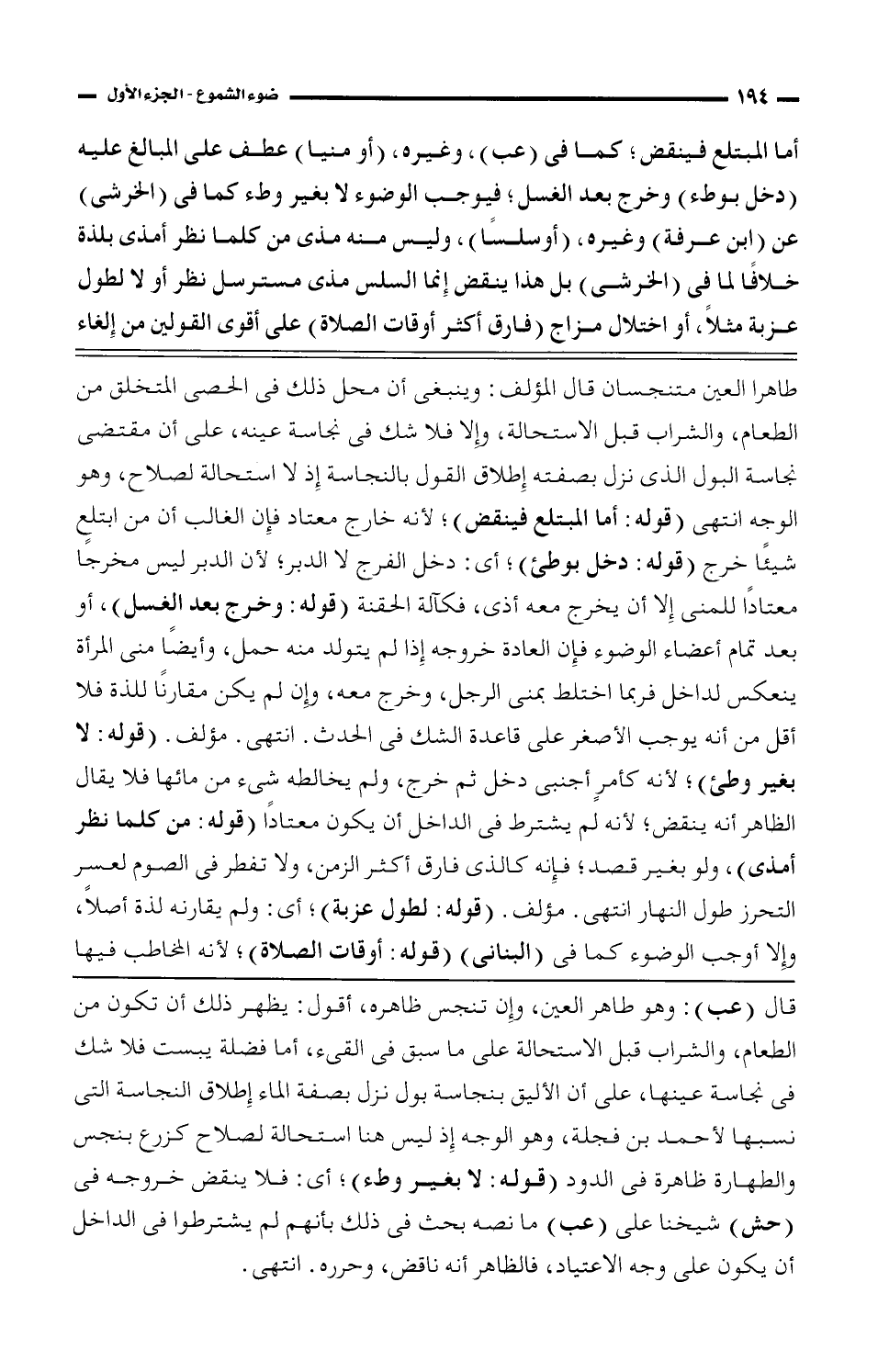 طاهرا العين متنجسان قال المؤلف: وينبغي أن محل ذلك في الحصى المتخلق من الطعام، والشراب قبل الاستحالة، وإلا فلا شك في نجاسة عينه، على أن مقتضى نجاسة البول الذي نزل بصفته إطلا القول بالنجاسة إذ لا استحالة لصلاح، وهو الوجه انتهى (قوله: أما المبتلع فينقض)؛ لأنه خارج معتاد فإن الغالبأن من ابتلع شيئًا خرج (قوله: دخل بوطء)؛ أى: دخل الفرج لا اللدبر؛ لأن الدبر ليس مخرجا معتادًا للمنى إلا أن يخرج معه أذى، فكآلة الحقنة (قوله: وخرج بعد الغسل)، أو بعد تمام أعضاء الوضوء فإن العادة خروجه إذا لم يتولد منه حمل، وأيضًا منى المرأة ينعكس لداخل فربما اختلط بمنى الرجل، وخرج معه، وإن لم يكن مقارنًا للذة فلا أقل من أنه يوجب الأصغر على قاعدة الشك في الحدث. انتهى. مؤلف. (قوله: لا بغير وطء)؛ لأنه كأمرٍ أجنبي دخل في ثم خرج، ولم يخالطه شيءمن مائها فلا يقال الظاهر أنه ينقض؛ لأنه لم يشترط في الداخل أن يكون معتادًا (قوله: من كلما نظر أمذى)، ولو بغير قصد؛ فإنه كالذي فارق أكثر الزمن، ولا تفطر في الصوم لعسر التحرز طول النهار انتهى. مؤلف. (قوله: لطول عزبة)؛ أى: ولم يقارنه لذة أصلًا، وإلا أوجب الوضوء كما في (البناني) (قوله: أوقات الصلاة)؛ لأنه المخاطب فيها