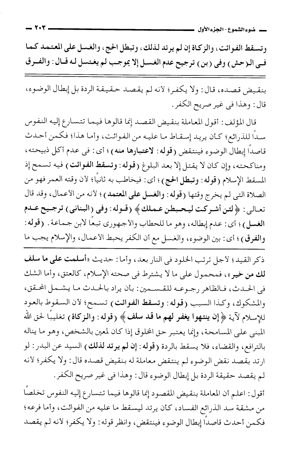 قال المؤلف: أقول المعاملة بنقيض القصد إنما قالوها فيما تتسارع إليه النفوس سدًا للذرائع؛ كأن إسقاط ما عليه من الفوائت، وأما هذا؛ فكمن أحدث قاصدًا إبطال الوضوء فينتقض (قوله: لاعتبارها منه)؛ أي: في عدم أكل ذبيحته، ومناحكته، وإن كان لا يقتل إلا بعد البلوغ (قوله: وتسقط الفوائت) فيه تسمح إذ المسقط الإسلام (قوله: وتبطل الحج)؛ أي: فيخاطب به ثانيًا؛ لأن وقته العمر فهو من الصلاة التي لم يخرج وقتها (قوله: والغسل على المعتمد)؛ لأنه من الأعمال، وقد قال تعالى: {لئن أشركت ليحبطن عملك} (قوله: وفي (البناني) ترجيح عدم الغسل)؛ أي: عدم إبطاله، وهو ما للحطاب والأجهوري تبعًا لابن جماعة. (قوله: والفرق)؛ أي: بين الوضوء، والغسل مع أن الكفر يحبط الأعمال، والإسلام يجب ما
