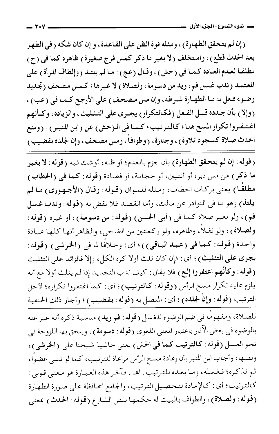 للصلاة، ومفهومًا في ضم الوضوء للغسل (قوله: فم ويد) مناسبة ذكره أنه عبر عنه بالوضوء في بعض الآثار باعتبار المعنى اللغوي (قوله: دسومة)، ويلحق بها اللزوجة في نحو العسل (قوله: كالترتيب كما في الحش) يعني حاشية شيخنا على (الخرشي)، ونصها، وأجاب ابن المنير بأن إعادة مسح الرأس مراعاة للترتيب، كما لو نسى عضوًا، ثم تذكره؛ فغسله، وما بعده للترتيب. اه. فآخر هذه العبارة هو معنى قولى: كالترتيب؛ أي: كالإعادة لتحصيل الترتيب، والجامع المحافظة على صورة الطهارة (قوله: ولصلاة)، والطواف بالبيت له حكمها بنص الشارع (قوله: الحدث) بمعنى