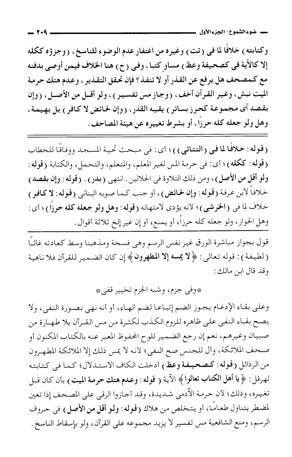 وعلى بقاء الإدغام يجوز الضم إتباعا لضم الهاء، أو أنه نهى بصورة النفي، ولا يصح بقاء النفي على ظاهره للزوم الكذب لكثرة من مس القرآن بلا طهارة من صبيان وغيرهم، نعم إن رجع الضمير للوح المحفوظ المعبر عنه بالكتاب المكنون أو صحة الملائكة، وأل للجنس صح النفي؛ لأنه لا يمس ذلك إلا الملائكة المطهرون من الرذائل (قوله: كصحيفة وعظ) أدخلت الكاف الاستدلال؛ كما في كتابته لهرقل: {ياأهل الكتاب تعالوا} الآية (قوله: وعدم هتك حرمة الميت) بأن كان قبل تغيره، وذلك؛ لأن حرمة الآدمي شديدة، وقد أجازوا الرقي على المصحف إذا تعين لمضطر يتناول طعامًا، أو يتخلص من هلاك (قوله: ولو أقل من الأصل) في حروف الرسم، ومنع الشافعية مس تفسير لا يزيد مجموعه على القرآن، ولو بإسقاط الناسخ.
