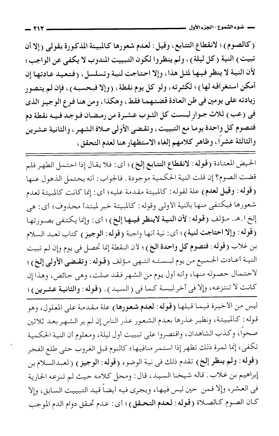ليس من الأخيرة فيما قبلها (قوله: لعدم شعورها) علة مقدمة على المعلول، وهو قوله: كالمبيته، ونظير عذرها بعدم الشعور عذر الناس إن لم ير الشهر بعد ثلاثين صحوًا، وكذب الشاهدان، واقتصروا على تبييت أول ليلة، ومعلوم أن النية الحكمية تكفي، إنما ثمرة ذلك نظهر إذا استمر منافيها؛ كالنوم قبل الغروب حتى طلع الفجر (قوله: ولم ينظر إلخ) تقدم ذلك في نية الوضوء (قوله: الوجيز) (لعبد السلام بن إبراهيم بن غلاب. قال شيخنا السيد، قال: ومحل كلامه حيث لم تنزعه الجارية في العشر، وإلا فمن حين لبس فيها، ويجري فيه أيضًا قيد التبييت السابق، وإلا كان الصوم كالصلاة (قوله: لعدم التحقق)؛ أي: عدم تحقق دوام الدم الموجب