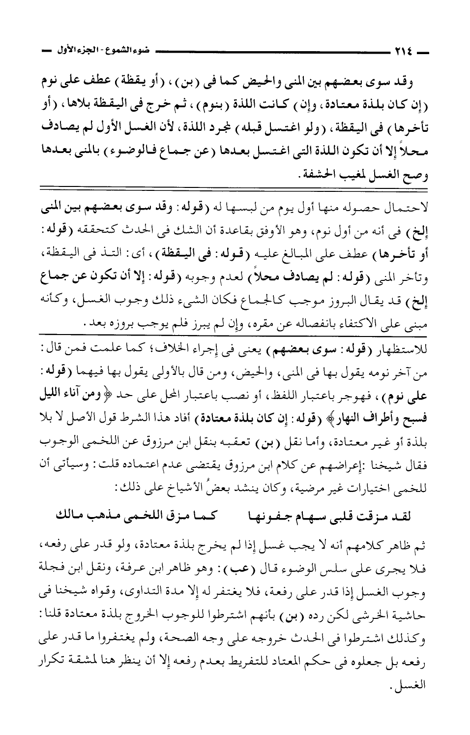 للاستظهار (قوله: سوى بعضهم) يعني في إجراء الخلاف؛ كما علمت فمن قال: من آخر نومه يقول بها في المنى، والحيض، ومن قال بالأولى يقول بها فيهما (قوله: على نوم)، فهو جر باعتبار اللفظ، أو نصب باعتبار المحل على حد {ومن آناء الليل فسبح وأطراف النهار} (قوله: إن كان بلذة معتادة) أفاد هذا الشرط قول الأصل لا بلا بلذة أو غير معتادة، وأما نقل (بن) تعقبه بنقل ابن مرزوق عن اللخمي الوجوب فقال شيخنا: إعراضهم عن كلام ابن مرزوق يقتضي عدم اعتماده قلت: وسيأتي أن للخمى اختيارات غير مرضية، وكأن ينشد بعض الأشياخ على ذلك: