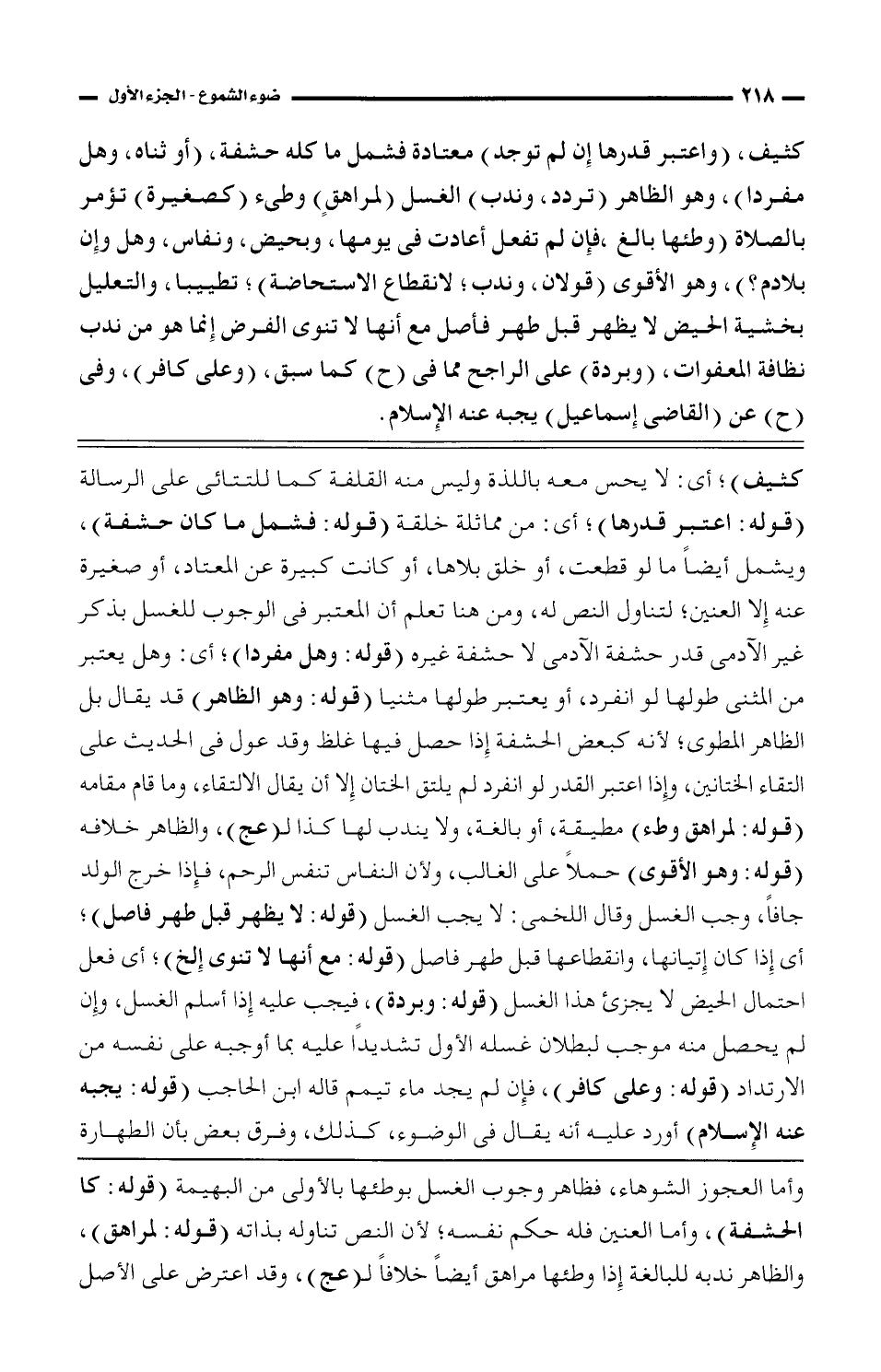 كثيف)؛ أي: لا يحس معه باللذة وليس منه القلفة كما للتتائي على الرسالة (قوله: اعتبر قدرها)؛ أي: من مماثلة خلقة (قوله: فشمل ما كان حشفة)، ويشمل أيضًا ما لو قطعت، أو خلق بلاها، أو كانت كبيرة عن المعتاد، أو صغيرة عنه إلا العنين؛ لتناول النص له، ومن هنا تعلم أن المعتبر في الوجوب للغسل بذكر غير الآدمى قدر حشفة الآدمي لا حشفة غيره (قوله: وهل مفردًا)؛ أي: وهل يعتبر من المثنى طولها لو انفرد، أو يعتبر طولها مثنيًا (قوله: وهو الظاهر) قد يقال بل الظاهر المطوى؛ لأنه كبعض الحشفة إذا حصل فيها غلط وقد عول في الحديث على التقاء الختانين، وإذا اعتبر القدر لو انفرد لم يلتق الختان إلا أن يقال الالتقاء، وما قام مقامه (قوله: لمراهق وطء) مطيقة، أو بالغة، ولا يندب لها كذا لـ (عج)، والظاهر خلافه (قوله: وهو الأقوى) حملًا على الغالب، ولأن النفاس تنفس الرحم، فإذا خرج الولد جافًات، وجب الغسل وقال اللخمي: لا يجب (قوله: لا يظهر قبل طهر فاصل)؛ أى فعل احتمال الحيض لا يجزئ هذا الغسل (قوله: وبردة)، فيجب عليه إذا أسلم الغسل، وإن لم يحصل منه موجب لبطلان غسله الأول تشديدًا عليه بما أوجبه على نفسه من الارتداد (قوله: وعلى كافر)، فإن لم يجد ماء تيمم قاله ابن الحاجب (قوله: يجبه عنه الإسلام) أورد عليه أنه يقال في الوضوء، كذلك وفرق بعض بأن الطهارة