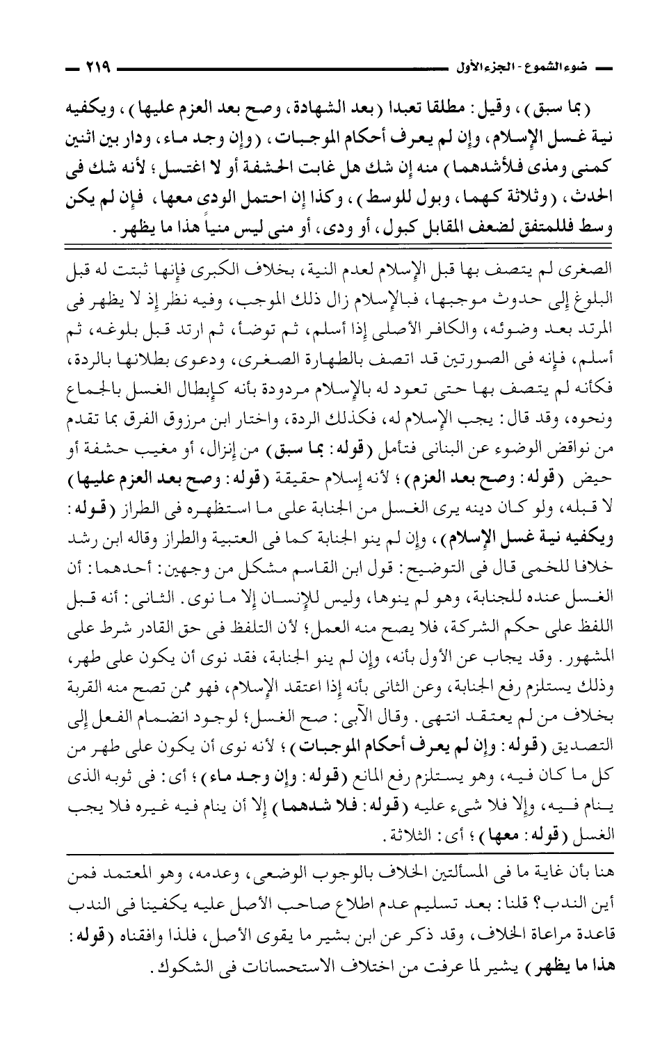 الصغرى لم يتصف بها قبل الإسلام لعدم النية، بخلاف الكبرى فإنها ثبتت له قبل البلوغ إلى حدوث موجبها، فبالإسلام زال ذلك الموجب، وفيه نظر إذ لا يظهر في المرتد بعد وضوئه، والكافر الأصلى إذا أسلم، ثم توضأ، ثم ارتد قبل بلوغه، ثم أسلم، فإنه في الصورتين قد اتصف بالطهارة الصغرى، ودعوى بطلانها بالردة، فكأنه لم يتصف بها حتى تعود له بالإسلام مردودة بأنه كإبطال الغسل بالجماع ونحوه، وقد قال: يجب الإسلام له، فكذلك الردة، واختار ابن مرزوق الفرق بما تقدممن نواقض الوضوء عن البناني فتأمل (قوله: بما سبق) من إنزال، أو مغيب حشفة أو حيض (قوله: وصح بعد العزم)؛ لأنه إسلام حقيقة (قوله: وصح بعد العزم عليها) لا قبله، ولو كان دينه يرى الغسل من الجنابة على ما استظهره في الطراز (قوله: ويكفيه نية غسل الإسلام)، وإن لم ينو الجنابة كما في العتبية والطراز وقاله ابن رشد حلافًا للخمى قال في التوضيح: قول ابن القاسم مشكل من وجهين: أحدهما: أن الغسل عنده للجنابة، وهو لم ينوها، وليس للإنسان إلا ما نوى. الثان: أنه قبل اللفظ على حكم الشركة، فلا يصح منه العمل؛ لأن التلفظ في حق القادر شرط على المشهور. وقد يجاب عن الأول بأنه، وإن لم ينو الجنابة، فقد نوى أن يكون على طهر، وذلك يستلزم رفع الجنابة، وعن الثاني بأنه إذا اعتقد الإسلام، فهو ممن تصح منه القربة بخلاف من لم يعتقد انتهى. وقال الآبي: صح الغسل؛ لوجود انضمام الفعلإلى التصديق (قوله: وإن لم يعرف أحكام الموجبات)؛ لأنه نوى أن يكون على طهر من كل ما كان فيه، وهو يستلزم رفع المانع (قوله: وإن وجد ماء)؛ أي: في ثوبه الذي ينام فيه، وإلا فلا شيء عليه (قوله: فلا شدهما) إلا أن ينام فيه غيره فلا يجب الغسل (قوله: معها)؛ أي: الثلاثة.