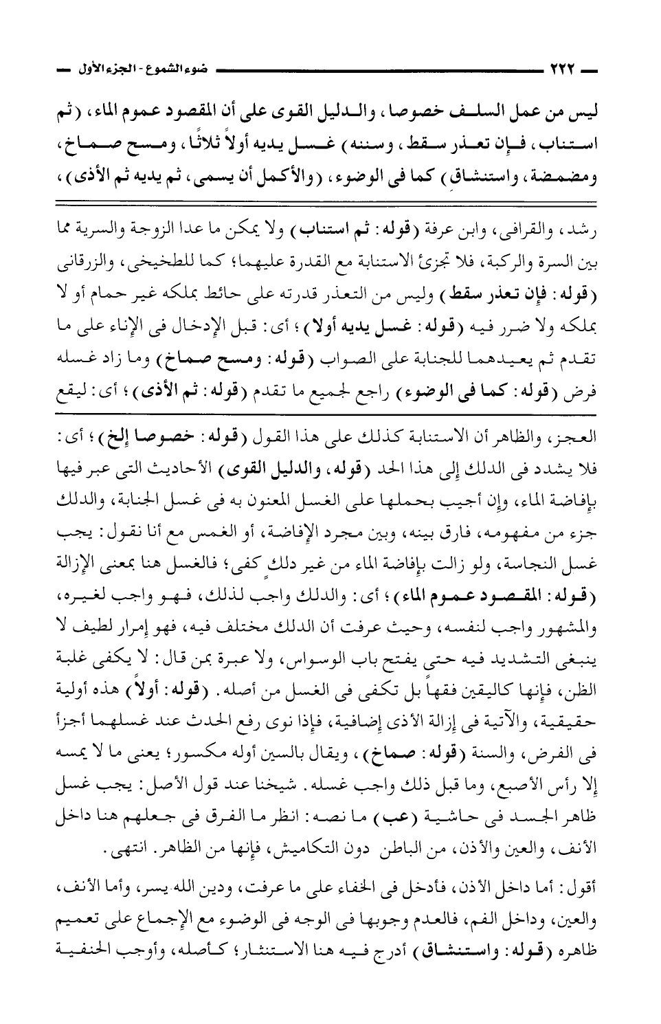 أقول: أما داخل الأذن، فأدخل في الخفاء على ما عرفت، ودين الله يسر، وأما الأنف، والعين، وداخل الفم/، فالعدم وجوبها في الوجه في الوضوء مع الإجماع على تعميم ظاهره (قوله: واستنشاق) أدرج فيه هنا الاستنثار؛ كأصله، وأوجب الحنفية