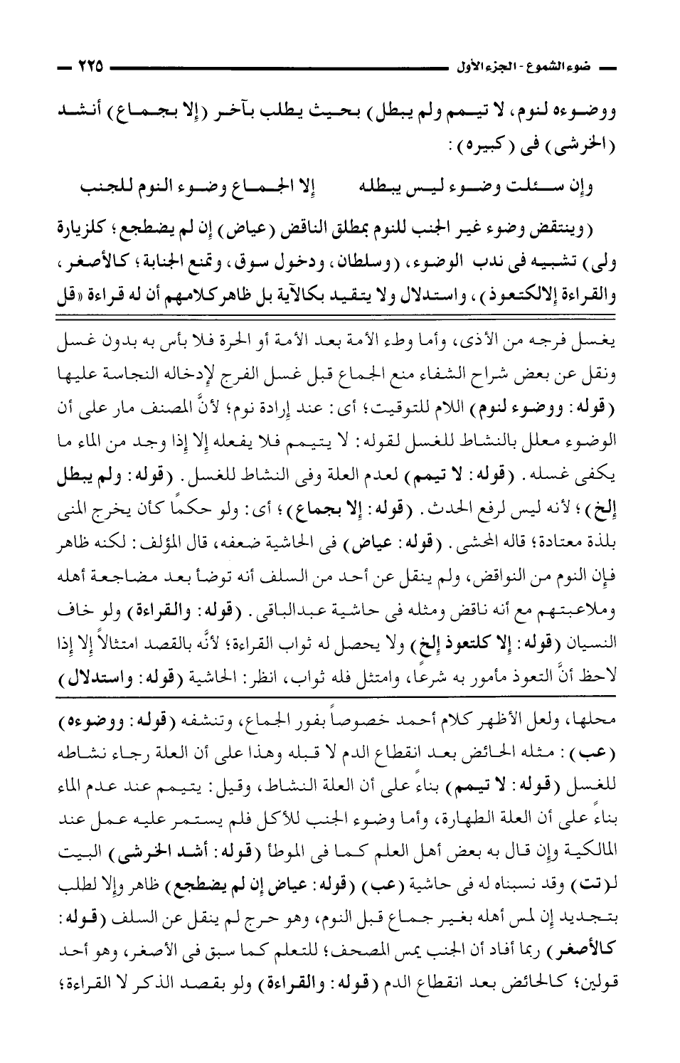 يغسل فرجه من الأذى، وأما وطء الأمة بعد الأمة أو الحرة فلا بأس به بدون غسل ونقل عن بعض شراح الشفاء منع الجماع قبل غسل الفرج لإدخاله النجاسه عليها (قوله: ووضوء لنوم) اللام للتوقيت؛ أي: عند إرادة نوم؛ لأن المصنف مار على أن الوضوء معلل بالنشاط للغسل لقوله: لا يتيمم فلا يفعله إلا إذا وجد من الماء ما يكفي غسله. (قوله: لا تيمم) لعدم العلة وفي النشاط للغسل. (قوله: ولم يبطل الخ)؛ لأنه ليس لرفع الحدث. (قوله: إلا بجماع)؛ أي: ولو حكمًا كأن يخرج المني بلذة معتادة؛ قاله المحشي. (قوله: عياض) في الحاشية ضعفه، قال المؤلف: لكنه ظاهر فإن النوم من النواقض، ولم ينقل عن أحد من السلف أنه توضأ بعد مضاجعة أهله وملاعبتهم مع أنه ناقض ومثله في حاشية عبد الباقي. (قوله: والقراءة) ولو خاف النسيان (قوله: إلا كلتعوذ الخ) ولا يحصل له ثواب القراءة؛ لأنه بالقصد امتثالًا إلا إذا لاحظ أن التعوذ مأمور به شرعًا، وامتثل فله ثواب، أنظر: الحاشية (قوله: واستدلال)