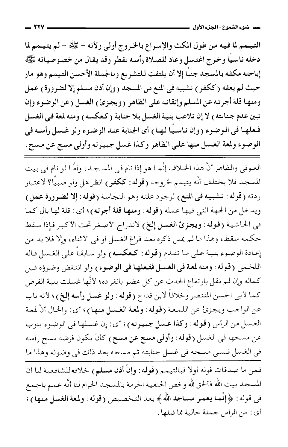 فمن ما صدقات قوله أولًا فبالتيمم (قوله: وإن أذن مسلم) خلافًا للشافعية لنا أن المسجد بيت الله فألحق لله وخص الحنفية الحرمة بالمسجد الحرام لنا أنه عمم بالجمع في قوله: {إنما يعمر مساجد الله} بعد التخصيص (قوله: ولمعة الغسل منها)؛ أي: من الرأس جملة حالية مما قبلها.