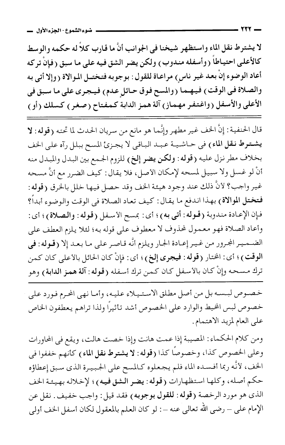 ومن كلام الحكماء: (المصيبة إذا عمت هانت، وإذا خصت هالت)، ويقع في المحاورات وعلى الخصوص كذا، وخصوصًا كذا (قوله: لا يشترط نقل الماء) كأنهم خففوا في الخف؛ لأنه ربما أفسده الماء فلم يجعلوه كالمسح على الجبيرة الذي سبق إعطاؤه حكم أصله، وكلها استظهارات (قوله: يضر الشق فيه)؛ لإخلاله بهيئة الخف الذي هو مورد الرخصة (قوله: للقول بوجوبه) فقد قيل: واجب خفيف. نقل عن الإمام علي- رضي الله تعالى عنه-: لو كان العلم بالمعقول لكان أسفل الخف