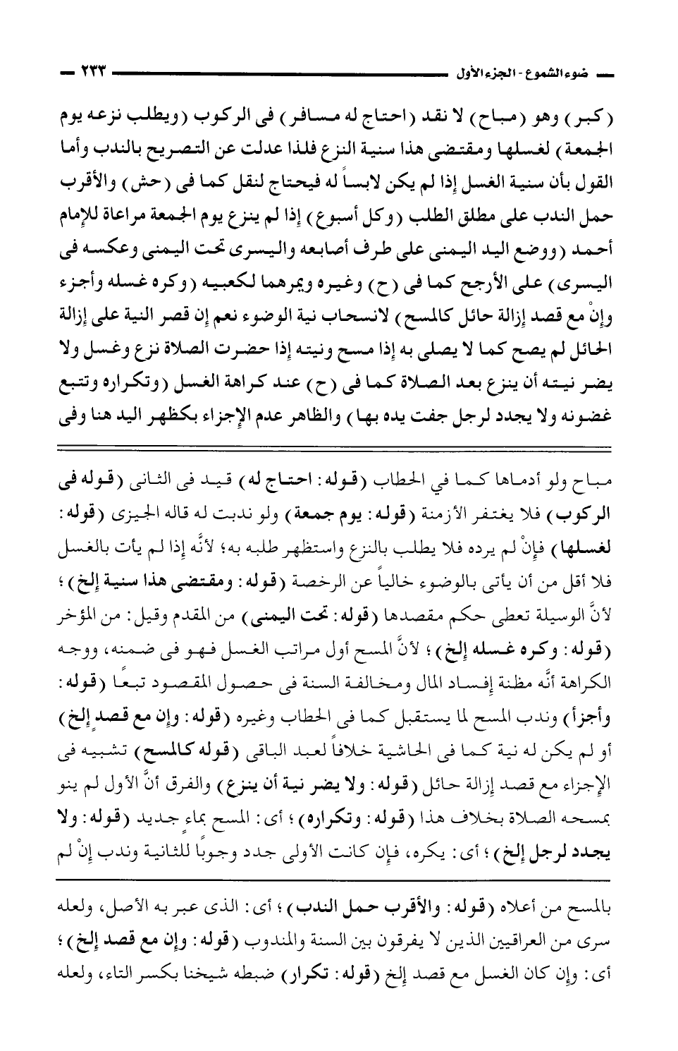 (كبر) وهو (مباح) لا نقد (احتاج له مسافر) في الركوب (ويطلب نزعه يوم الجمعة) لغسلها ومقتضى خذا سنية النزع فلذا عدلت عن التصريح بالندب وأما القول بأن سنية الغسل إذا لم يكن لابسًا له فيحتاج لنقل كما في (حش) والأقرب حمل الندب على مطلق الطلب (وكل أسبوع) إذا لم ينزع يوم الجمعة مراعاة للإمام أحمد (ووضع اليد اليمنى على طرف أصابعه واليسرى تحت اليمنى وعكسه في اليسرى) على الأرجح كما في (ح) وغيره ويمرهما لكعبيه (وكره غسله وأجزاء وإن مع قصد إزالة حائل كالمسح) لانسحاب نية الوضوء نعم إن قصر النية على إزالة الحائل لم يصح كما لا يصلي به إذا مسح ونيته إذا حضرت الصلاة نزع وغسل ولا يضر نيته أن ينزع بعد الصلاة كما في (ح) عند كراهة الغسل (وتكراره وتتبع غصونه ولا يجدد لرجل جفت يده بها) والظاهر عدم الإجزاء بكظهر اليد هنا وفي