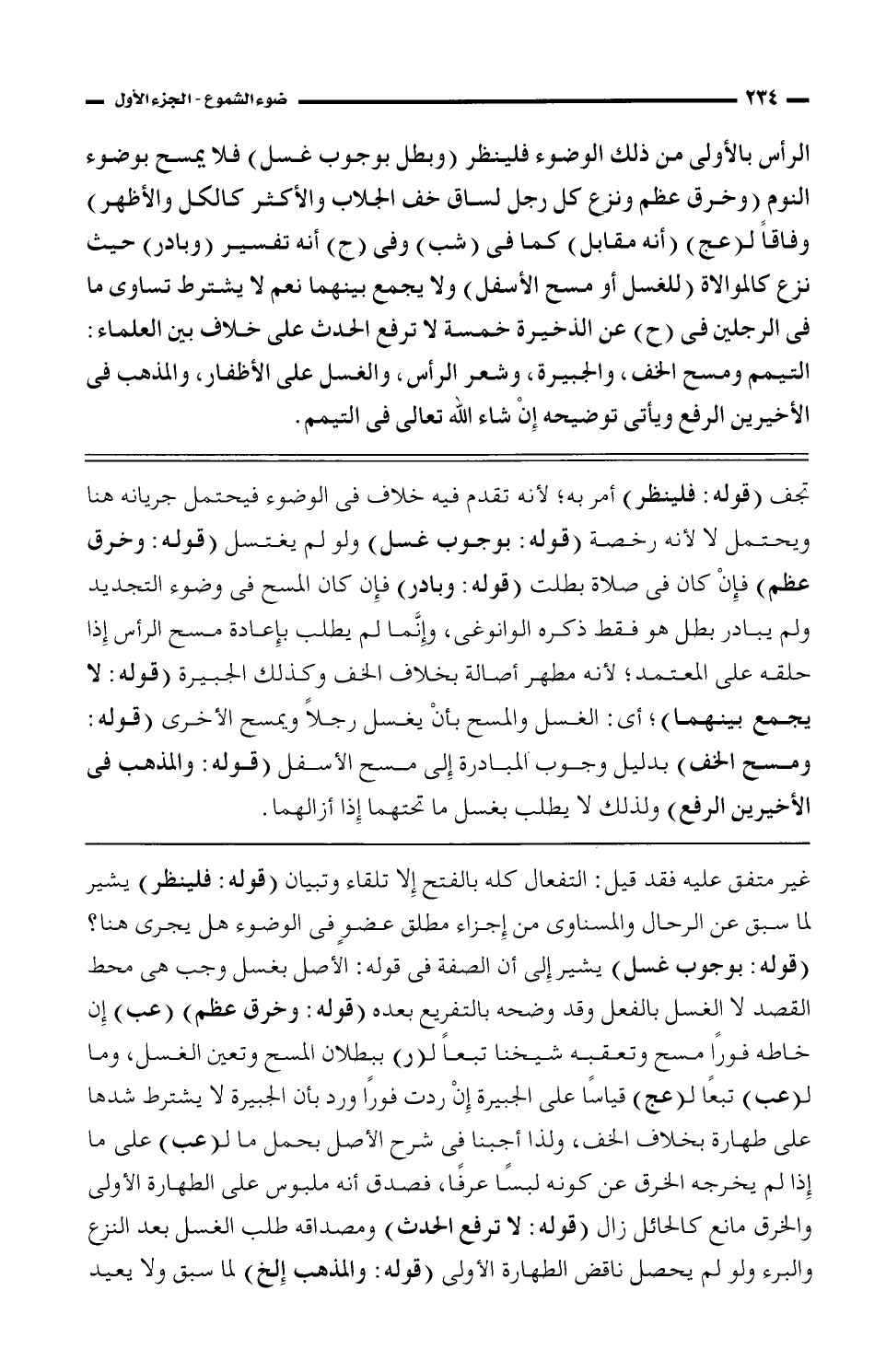 وجوبًا للثانية وندب إن لم تجف (قوله: فلينظر) أمر به؛ لأنه تقدم فيه خلاف في الوضوء فيحتمل جريانه هنا ويحتمل لا؛ لأنه رخصه (قوله: بوجوب غسل) ولو لم يغتسل (قوله: وخرق عظم) فإن كان في صلاة بطلت (قوله: وبادر) فإن كان المسح في وضوء التجديد ولم يبادر بطل هو فقط ذكره الوانوغي، وإنما لم يطلب بإعادة مسح الرأس إذا حلقه على المعتمد؛ لأنه مطهر أصالة بخلاف الخف؛ وكذلك الجبيرة (قوله: لا يجمع بينهما)؛ لأي: الغسل والمسح بأن يغسل رجلًا ويمسح الأخرى (قوله: ومسح الخف) بدليل وجوب المبادرة إلى مسح الأسفل (قوله: والمذهب في الأخيرين الرفع) ولذلك لا يطلب بغسل ما تحتهما إذا أزالهما.