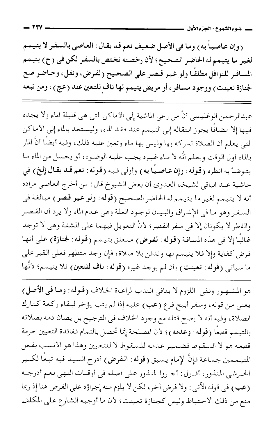 عبد الرحمن الوغليسي أن من رعى الماشية إلى الأماكن التي هي قليلة الماء ولا يجده فيها إلا مضافًا يجوز انتقاله إلى التيمم عند فقد الماء، وليستعد بالماء إلى الأماكن التي يعلم أن الصلاة تدركه بها وليس بها ماء وتعين عليه ذلك، وفيه أيضًا أن المار بالماء أول الوقت ويعلم أنه لا ماء غيره يجب عليه الوضوء، أو يحمل من الماء ما يتوضأ به أنظره (قوله: وإن عاصيًا به) وأولى فيه (قوله: نعم قد يقال الخ) في حاشية عبد الباقي لشيخنا العدوي أن بعض الشيوخ قال: من أخرج العاصي مراده أنه لا يتيمم لغير ما يتيمم له الحاضر الصحيح (قوله: ولو غير قصر) مبالغة في السفر وهو ما في الإشراق والبيان لوجود العلة وهي عدم الماء ولا يرد أن القصر والفطر لا يكونان إلا في سفر القصر؛ لأن التعويل فيهما على المشقة وهي لا توجد غالبًا إلى في هذه المسافة (قوله: لفرض) متعلق بتيمم (قوله: لجنازة) على أنها فرض كفاية وإلا فلا يتيمم لها وتدفن بلا صلاة، فإن وجد متطهر فعلى القبر على ما سيأتي (قوله: تعينت) بأن لم يوجد غيره (قوله: ناف للتعين) فلا يتيمم؛ لأنها