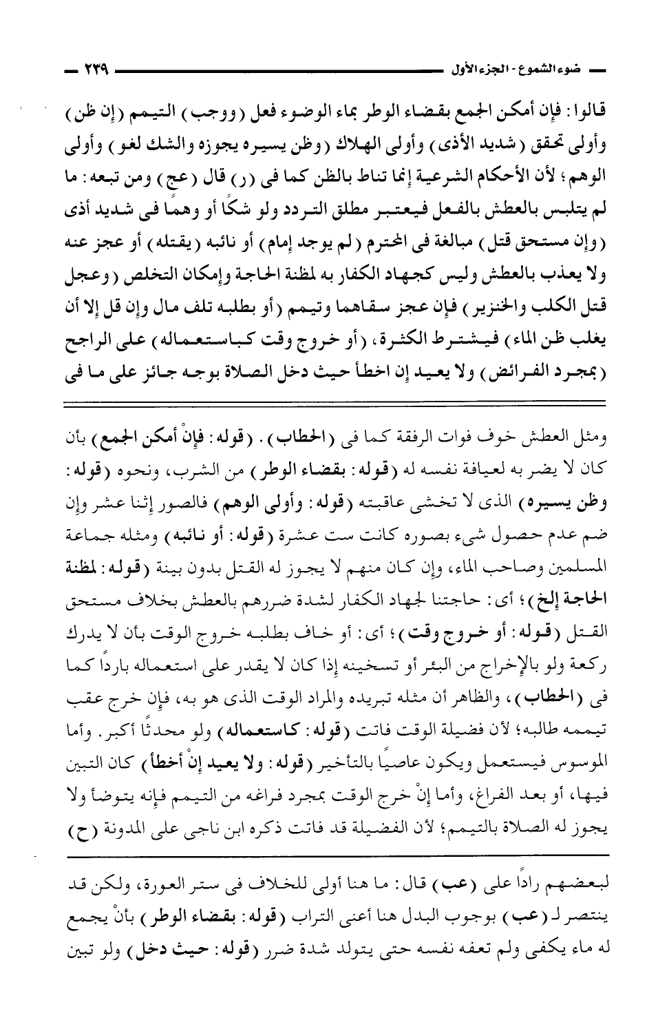 قالوا: فإن أمكن الجمع بقضاء الوطر بماء الوضوء فعل (ووجب) التيمم (إن ظن) وأولى تحقق (شديد الأذى) وأولى الهلاك (وظن يسيره يحوزه والشك لغو) وأولى الوهم؛ لأن الأحكام الشرعية إنما تناط بالظن كما في (ر) قال (عج) ومن تبعه: ما لم يتلبس بالعطش بالفعل فيعتبر مطلق التردد ولو شكًا أو وهمًا في شديد أذى (وإن مستحق قتل) مبالغة في المحترم (لم يوجد إمام) أو نائبه (يقتله) أو عجز عنه ولا يعذب بالعطش وليس كجهاد الكفار به لمظنة الحاجة وإمكان التخلص (وعجل قتل الكلب والخنزير) فإن عجز سقاهما وتيمم (أو بطلبه تلف مال وإن قل إلا أن يغلب ظن الماء) فيشترط الكثرة، (أو خروج وقت كباستعماله) على الراجح (بمجرد الفرائض) ولا يعيد إن اخطأ حيث دخل الصلاة بوجه جائز على ما في
