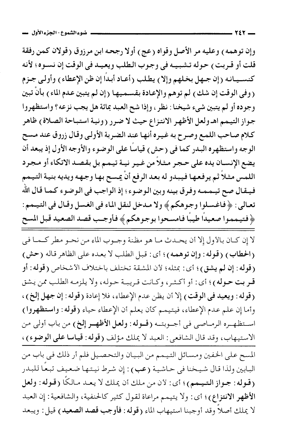 وإن توهمه) وعليه مر الأصل وقواه (عج) أولًا رجحه ابن مرزوق (قولان كمن رفقة قلت أو قربت) حوله تشبيه في وجوب الطلب ويعيد في الوقت إن نسوه؛ لأنه كنسيانه (إن جهل بخلهم وإلا) يطلب (أعاد أبدًا إن ظن الإعطاء) وأولى جزم (وفي الوقت إن شك) لم توهم والإعادة بقسميها (إن لم يتبين عدم الماء) بأن تبين وجوده أو لم يتبين شيء شيخنا: نظر، وإذا شح العبد بمائة هل يجب نزعه؟ واستظهروا جواز التيمم اهـ ولعل الأظهر الانتزاع حيث لا ضرر (ونية استباحة الصلاة) ظاهر الوجه واستظهره البدر كما في (حش) قياسًا على الوضوء والأوجه الأول إذ يبعد أن يضع الإنسان يده على حجر مثلًا من غير نية تيمم بل بقصد الاتكاء أو مجرد اللمس مثلًا ثم يرفعها فيبدو له بعد الرفع أن يمسح بها وجهه ويديه بنية التيمم فيقال صح تيممه وفرق بينه وبين الوضوء؛ إذ الواجب في الوضوء كما قال الله تعالى: {فاغسلوا وجوهكم} ولا مدخل لنقل الماء في الغسل وقال في التيمم: {فتيمموا صعيدًا طيبًا فامسحوا بوجوهكم} فأوجب قصد الصعيد قبل المسح