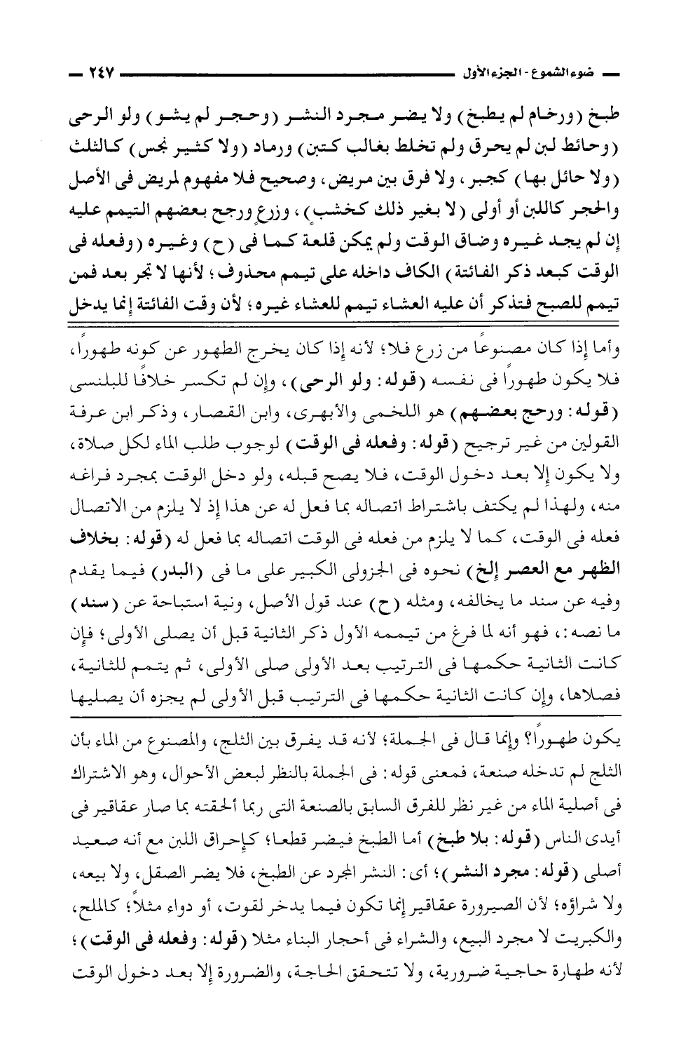 يكون طهورًا؟ وإنما قال في الجملة؛ لأنه قد يفرق بين الثلج، والمصنوع من الماء بأن الثلج لم تدخله صنعه، فمعنى قوله: في الجملة بالنظر لبعض الأحوال، وهو الاشتراك في أصلية الماء من غير نظر للفرق السابق بالصنعة التي ربما ألحقته بما صار عقاقير في أيدي الناس (قوله: بلا طبخ) أما الطبخ فيضر قطعًا؛ كإحراق اللبن مع أنه صعيد أصلي (قوله: مجرد النشر)؛ أي: النشر المجرد عن الطبخ، فلا يضر الصقل، ولا بيعه، ولا شراؤه؛ لأن الصيرورة عقاقير إنما تكون فيها يدخر لقوت، أو دواء مثلًا؛ كالملح، والكبريت لا مجرد البيع، والشراء في أحجار البناء مثلًا (قوله: وفعله في الوقت)؛ لأنه طهارة حاجية ضرورية، ولا تتحقق الحاجة، والضرورة إلا بعد دخول الوقت