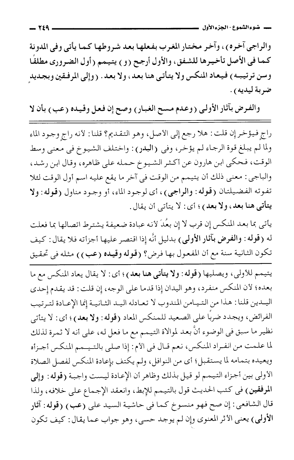 والراجي آخره)، وآخر مختار المغرب بفعلها بعد شروطها كما يأتي وفي المدونة كما في الأصل تأخيرها للشفق، والأول أرجح (و) يتيمم (أول الضروري مطلقًا وسن ترتيبه) فيعاد المنكس ولا يتأتى هنا بعد، ولا بعد. (وإلى المرفقين وبجديدٍ ضربة ليديه).