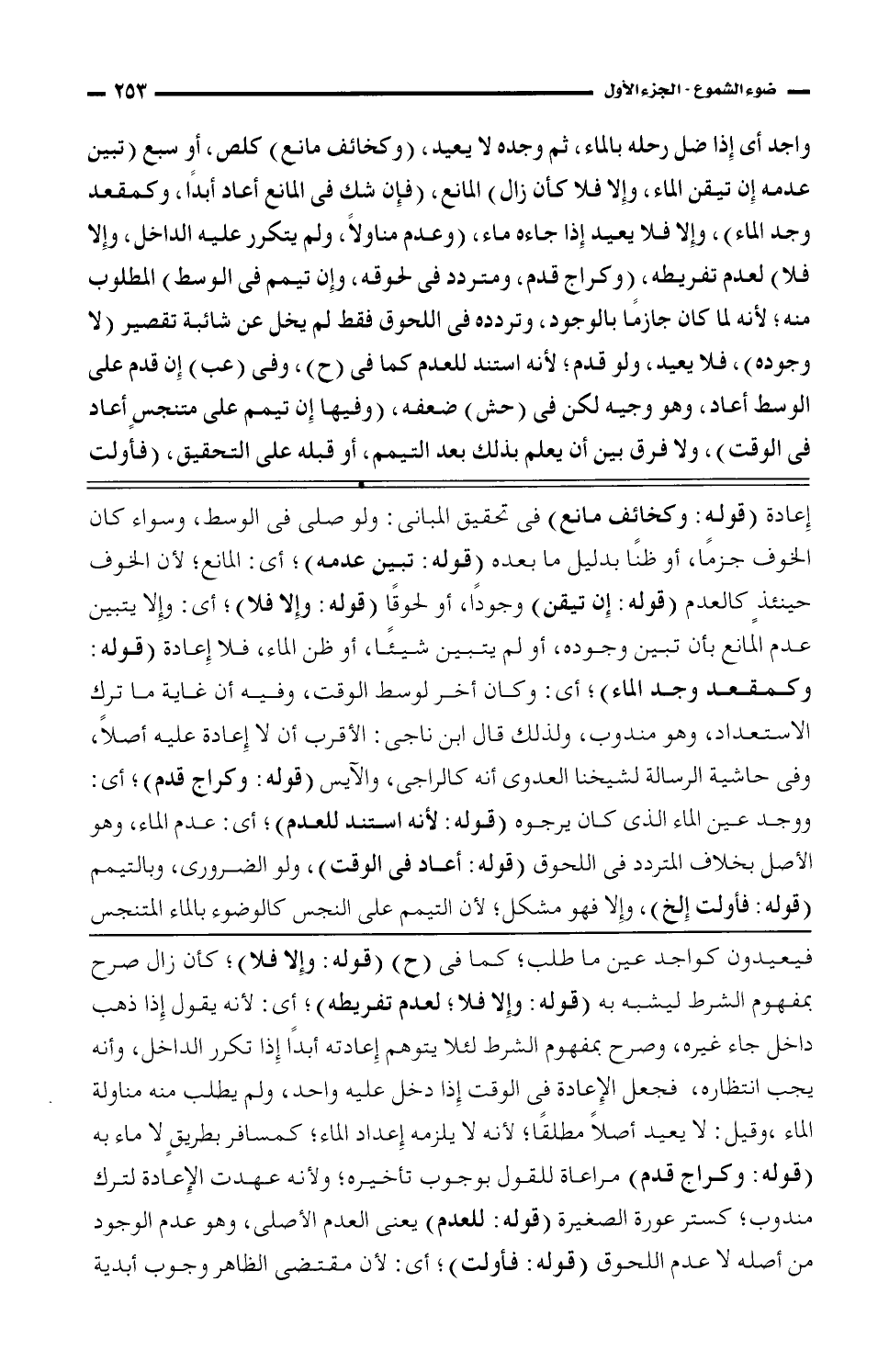 إعادة (قوله: وكخائف مانع) في تحقيق المباني: ولو صلى في الوسط، وسواء كان الخوف جزمًا، أو ظنًا بدليل ما بعده (قوله: تبين عدمه)؛ أي: المانع؛ لأن الخوف حينئذ كالعدم (قوله: إن تيقن) وجودًا، أو لحوقًا (قوله: وإلا فلا)؛ أي: وإلا يتبين عدم المانع بأن تبين وجوده، أو لم يتبين شيئًا، أو ظن الماء، فلا إعادة (قوله: وكمقعد وجد الماء)؛ أي: وكان أخر لوسط الوقت، وفيه أن غاية ما ترك الاستعداد، وهو مندوب؛ ولذلك قال ابن ناجي: الأقرب أن لا إعادة عليه أصلًا، وفي حاشية الرسالة لشيخنا العدوي أنه كالراجي، والآيس (قوله: وكراج قدم)؛ أي: ووجد عين الماء الذي كان يرجوه (قوله: لأنه استند للعدم)؛ أي: عدم الماء، وهو الأصل بخلاف المتردد في اللحوق (قوله: أعاد في الوقت)، ولو الضروري، وبالتيمم (قوله: فأولت الخ)، وإلا فهو مشكل؛ لأن التيمم على النجس كالوضوء بالماء المتنجس