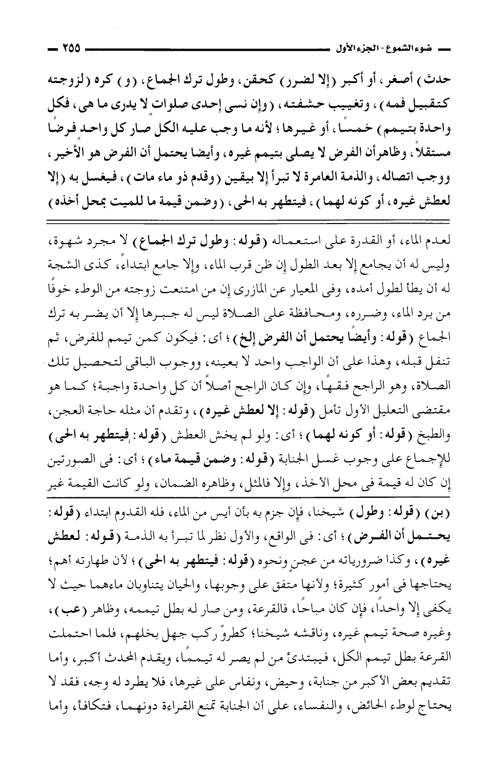 لعدم الماء، أو القدرة على استعماله (قوله: وطول ترك الجماع) لا مجرد شهوة، وليس له أن يجامع إلا بعد الطول إن ظن قرب الماء، وإلا جامع ابتداءً، كذي الشجة له أن يطأ لطول أمده، وفي المعيار عن المازري إن من امتنعت زوجته من الوطء خوفًا من برد الماء، وضرره، ومحافظة على الصلاة ليس له جبرها إلا أن يضربه ترك الجماع (قوله: وأيضًا يحتمل أن الفرض الخ)؛ أي: فيكون كمن تيمم للفرض، ثم تنفل قبله، وهذا على أن الواجب واحد لا بعينه، ووجوب الباقي لتحصيل تلك الصلاة، وهو الراجح فقهًا، وإن كان الراجح أصلًا أن كل واحدة واجبة؛ كما هو مقتضي التعليل الأول تأمل (قوله: إلا لعطش غيره)، وتقدم أن مثله حاجة العجن، والطبخ (قوله: أو كونه لهما)؛ أي: ولو لم يخش العطش (قوله: فيتطهر به الحي) للإجماع على وجوب غسل الجنابة (قوله: وضمن قيمة ماء)؛ أي: في الصورتين إن كان له قيمة في محل الأخذ، وإلا فالمثل، وظاهره الضمان، ولو كانت القيمة غير