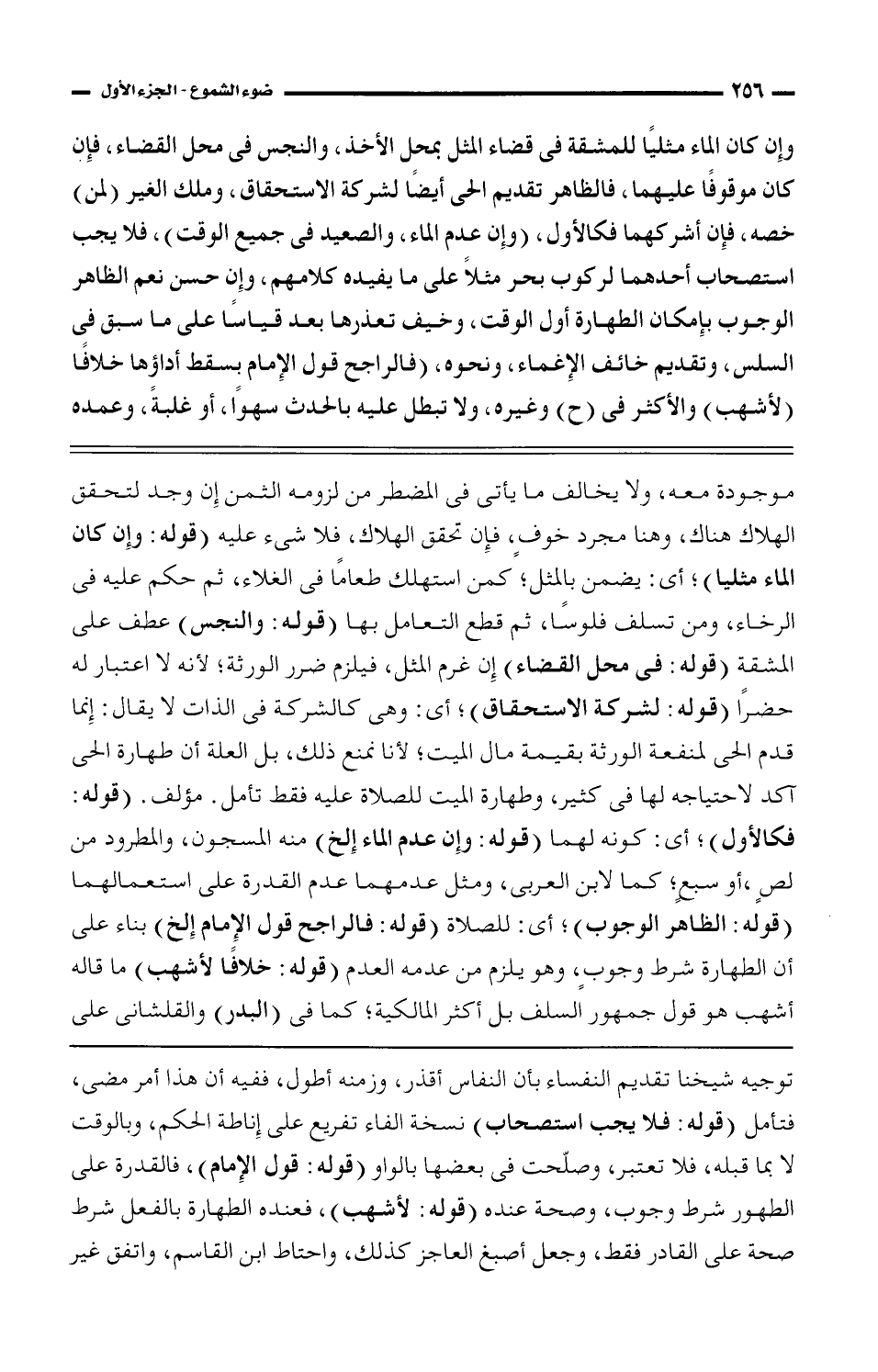 موجودة معه، ولا يخالف ما يأتي في المضطر من لزومه الثمن إن وجد لتحقق الهلاك هناك، وهنا مجرد خوف، فإن تحقق الهلاك، فلا شيء عليه (قوله: وإن كان الماء مثليًا)؛ أي: يضمن بالمثل؛ كمن استهلك طعامًا في الغلاء، ثم حكم عليه في الرخاء، ومن تسلف فلوسًا، ثم قطع التعامل بها (قوله: والنجس) عطف على المشقة (قوله: في محل القضاء) إن غرم المثل، فيلزم ضرر الورثة؛ لأنه لا اعتبار له حضرًا (قوله: لشركة الاستحقاق)؛ أي: وهي كالشركة في الذات لا يقال: إنما قدم الحي لمنفعة الورثة بقيمة مال الميت؛ لأن نمنع ذلك، بل العلة أن طهارة الحي أكد لاحتياجه لها في كثير، وطهارة الميت للصلاة عليه فقط تأمل. مؤلف. (قوله: فكالأول)؛ أي: كونه لهما (قوله: وإن عدم الماء الخ) منه المسجون، والمطرود من لص، أو سبعٍ؛ كما لابن العربي، ومثل عدمهما عدم القدرة على استعمالهما (قوله: الظاهر الوجوب)؛ أي: للصلاة (قوله: فالراجح قول الإمام الخ) بناء على أن الطهارة شرط وجوبٍ، وهو يلزم من عدمه العدم (قوله: خلافًا لأشهب) ما قاله أشهب هو قول جمهور السلف بل أكثر المالكية، كما في (البدر) والقلشاني على