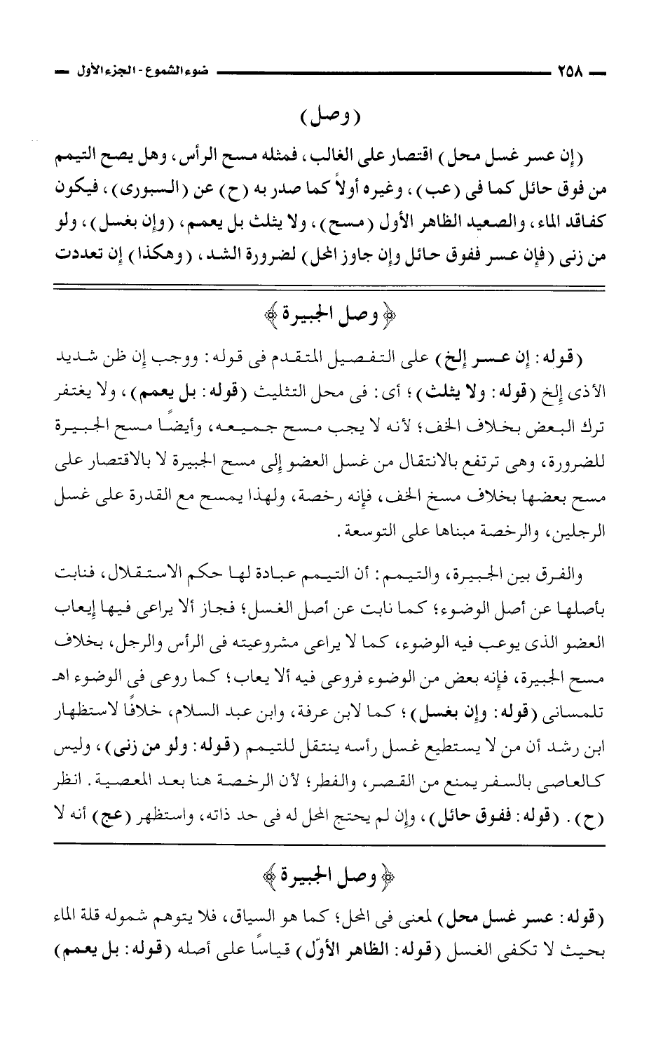 (إن عسر غسل محل) اقتصار على الغالب، فمثله مسح الرأس، وهل يصح التيمم من فوق حائل كما في (عب)، وغيره أولًا كما صدر به (ح) عن (السبوري)، فيكون كفاقد الماء، والصعيد الظاهر الأول (مسح)، ولا يثلث بل يعمم، (وإن بغسل)، ولو من زنى (فإن عسر ففوق حائل وإن جاوز المحل) لضرورة الشد، (وهكذا) إن تعددت
