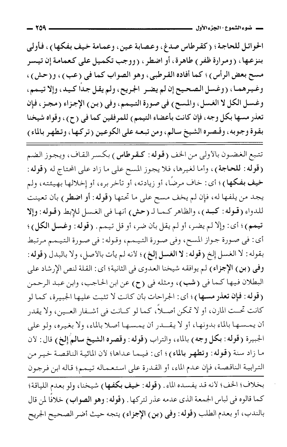 تتبع الغضون بالأولى من الخف (قوله: كقرطاس) بكسر القاف، ويجوز الضم (قوله: للحاجة)، وأما لغيرها، فلا يجوز المسح على ما زاد على المحتاج له (قوله: خيف بفكها)؛ أي: خاف مرضًا، أو زيادته، أو تأخر برء، أو إخلالها بهيئته، ولم يجد من يلفها له، فإن لم يخف مسح على ما تحتها (قوله: أو اضطر) بأن تعينت للدواء (قوله: كبد)، والظاهر كما لـ (حش) أنها في الغسل للإبط (قوله: وإلا تيمم)؛ أي: وإلا لم يضر أو لم يقل بأن ضر، أو قل تيمم. (قوله: وغسل الكل)؛ أي: في صورة جواز المسح، وفي صورة التيمم، وقوله: في صورة التيمم مرتبط بقوله: لا الغسل الخ (قوله: لا الغسل الخ)؛ لأنه لم يأت بالأصل، ولا بالبدل (قوله: وفي (بن) الإجزاء) لم يوافقه شيخنا العدوي في الثانية؛ أي: القلة لنص الإرشاد على البطلان فيها كما في (شب)، ومثله في (ح) عن ابن الحاجب، وابن عبد الرحمن (قوله: فإن تعذر مسها)؛ أي: الجراحات بأن كانت لا تثبت عليها الجبيرة، كما لو كانت تحت المارن، أو لا تمكن أصلًا، كما لو كانت في أشفار العين، ولا يقدر أن يمسها بالماء بدونها، أو لا يقدر أن يمسها أصلًا بالماء، ولا بغيره، ولو على الجبيرة (قوله: بكل وجه) بالماء، والتراب (قوله: وقصره الشيخ سالم الخ) قال: لأن ما زاد سنه (قوله: وتطهر بالماء)؛ أي: فيما عداها؛ لأن المائية الناقصة خير من الترابية الناقصة، فإن عدم الماء، أو القدرة على استعماله تيمم؛ قاله ابن فرجون