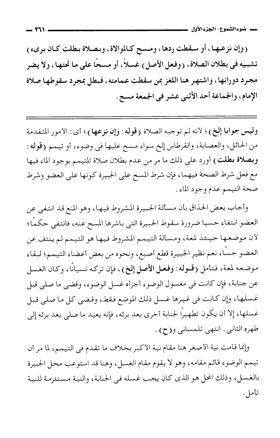 وإنما قامت نية الأصغر هنا مقام نية الأكبر بخلاف ما تقدم في التيمم، لما مر أن تيمم الوضوء قائم مقامه، وهو لا يقوم مقام الغسل، وهنا قد استوعب محل الجبيرة بالغسل؛ وذلك المحل هو الذي كان يجب غسله في الجنابة، والنية مستلزمة للنية تأمل.