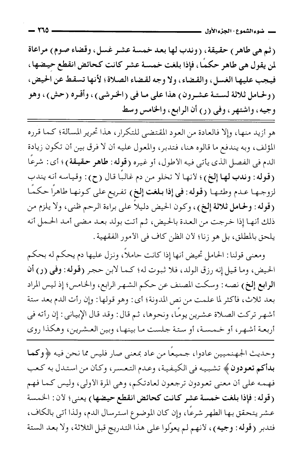 وحديث الجهنميين عادوا، جميعًا من عاد بمعنى صار فليس مما نحن فيه (وكما بدأكم تعودون) شبيه في الكيفية، وعدم التعسر، وكأن من استدل به كعب فهمه على أن معنى تعودون ترجعون لعادتكم، وهي المرة الأولى، وليس كما فهم (قوله: فإذا بلغت خمسة عشر كانت كحائض انقطع حيضها) يعني؛ لأن: الخمسة عشر يتحقق بها الطهر شرعًا، وإن كان الموضوع استرسال الدم، ولذا أتى بالكاف، فتدبر (قوله: وجيه)، لأنهم لم يعولوا على هذا التدريج قبل الثلاثة، ولا بعد الستة