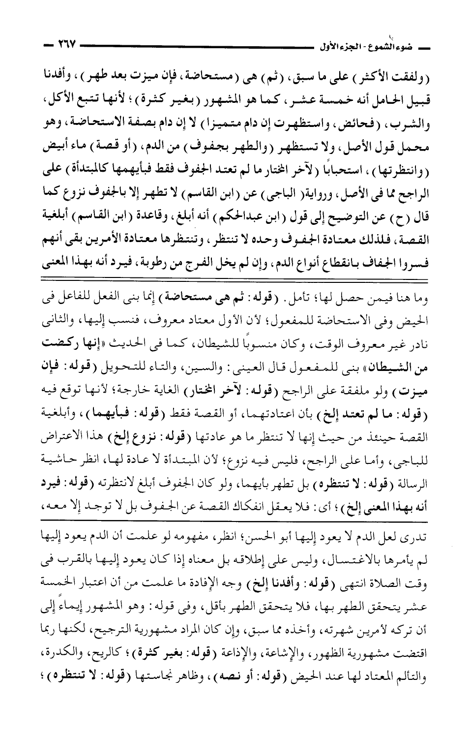 تدرى لعل الدم لا يعود إليها أبو الحسن؛ انظر، مفهومه لو علمت أن الدم يعود إليها لم يأمرها بالاغتسال، وليس على إطلاقه بل معناه إذا كان يعود إليها بالقرب في وقت الصلاة انتهى (قوله: وأفدنا إلخ) وجه الإفادة ما علمت من أن اعتبار الخمسة عشر يتحقق الطهر بها، فلا يتحقق الطهر بأقل، وفي قوله: وهو المشهور إيمًاء إلى أن تركه لأمرين شهرته، وأخذه مما سبق، وإن كان المراد مشهورية الترجيح، لكنها ربما اقتضت مشهورية الظهور، والإشاعة، والإذاعة (قوله: بغير كثرة)؛ كالريح، والكدرة، والتألم المعتاد لها عند الحيض (قوله: أو نصه)، وظاهر نجاستها (قوله: لا تنتظره)؛